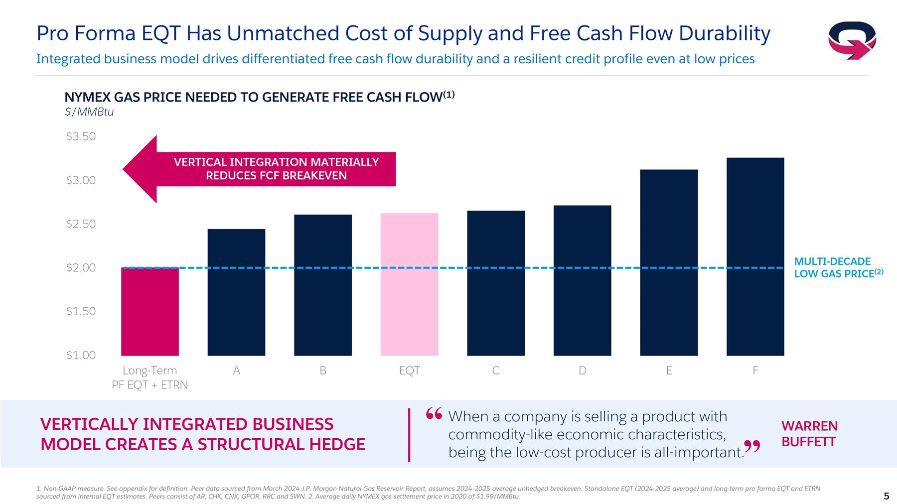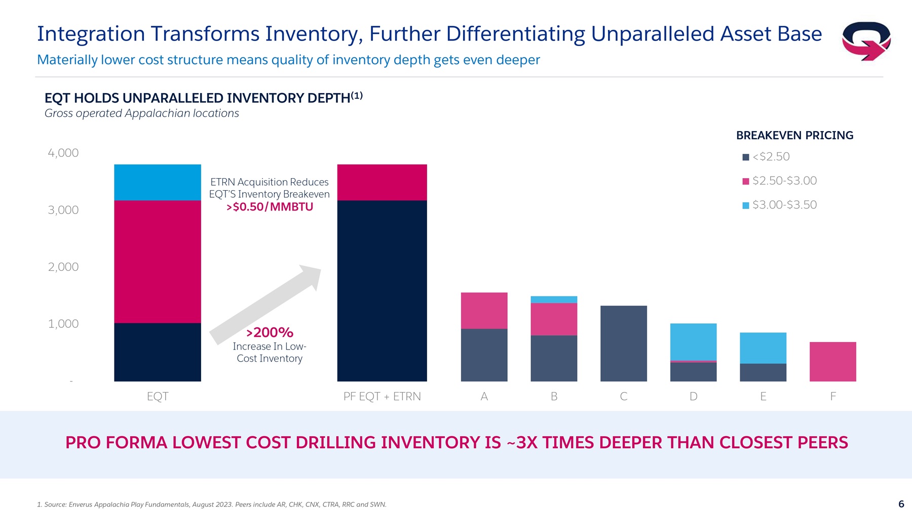 Pro forma for Equitrans, approximately 90% of our operator production will flow through EQT-owned Midstream assets, creating unrivaled margin enhancement relative to the rest of the industry. This vertical integration positions EQT as the lowest-cost natural gas producer in the United States with a pro forma long-term corporate free cash flow breakeven price of less than $2 per million BTU. This, in turn, transforms the quality of our already superior inventory depth as we will have three times the number of extremely low-cost drilling locations relative to our closest peers.