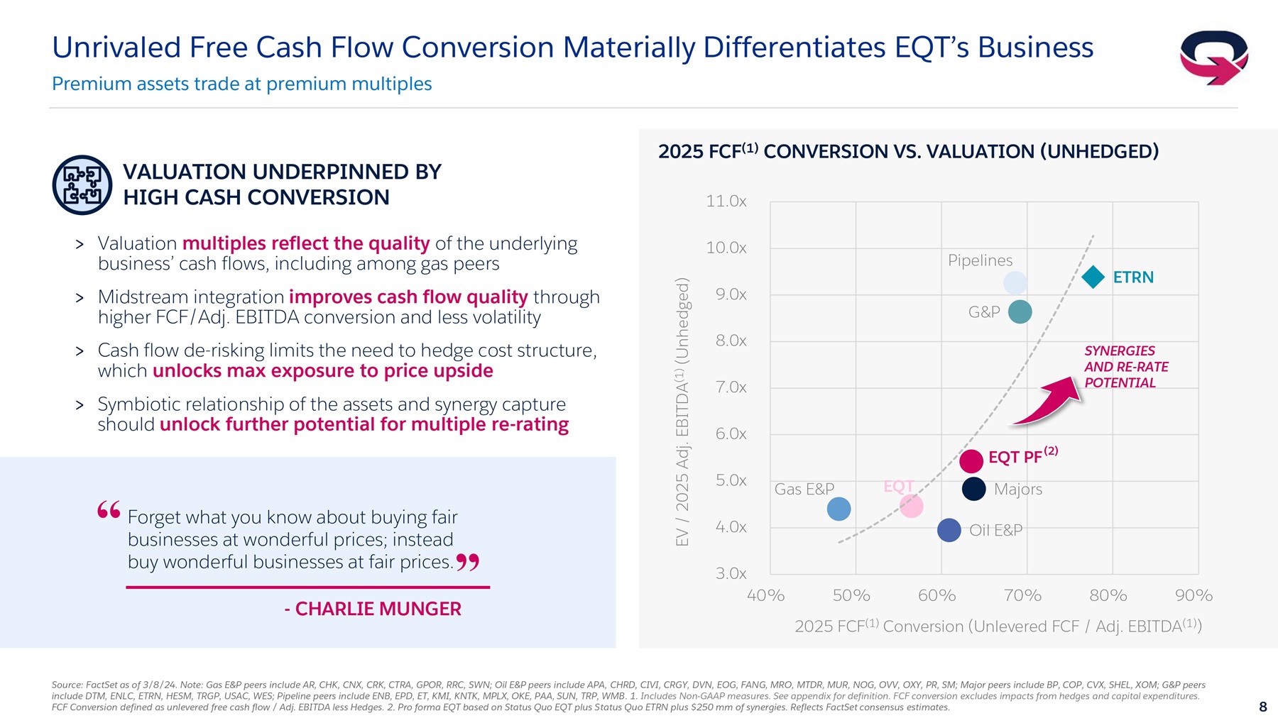 To further illustrate the impact of Equitrans has on our cash generation profile, we show free cash flow conversion ratios across a peer group and our updated investor deck. Free cash flow conversion measures how much of a company's EBITDA is converted to free cash flow, or intrinsic value. EQT was already at the high end of the peer group in terms of free cash flow conversion with high-cost Haynesville producers at the low end. But this transaction catapults EQT into a league of its own in terms of business quality, and intrinsic worth, and aligns us with a new peer group of major integrated businesses.