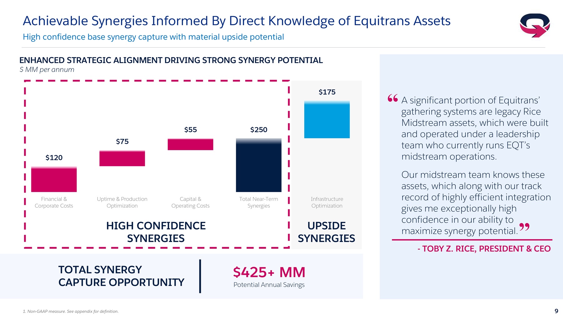 We are highly confident in achieving synergies from this transaction, given the direct knowledge we have of Equitrans’ operations and the extensive overlap across our core operating areas. Recall, a significant portion of Equitrans’ gathering systems are legacy Rice Midstream assets, which were built and operated under the leadership of Rob Wingo and Justin Trudell, who currently run EQT’s midstream operations. Rob, Justin and their team know these assets, which along with our track record of highly efficient integration gives me exceptionally high conviction in our ability to achieve these synergies.