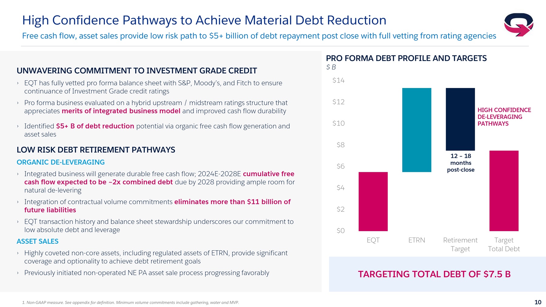 Looking at the balance sheet. We've spent significant time evaluating the deleveraging plan with all three credit rating agencies to ensure maintenance of investment grade ratings. This deleveraging plan includes a combination of organic free cash flow generation, and a near term target of $3.5 billion of assets sales, including selected regulated assets of Equitrans, providing significant coverage and optionality to achieve debt retirement goals. This leverage reduction plan should put the combined company on a glide path to absolute pro forma debt of roughly $7.5 billion, which equates to 2x adjusted EBITDA or approximately 6x unlevered free cash flow at $2.75 natural gas prices. Ensuring EQT maintains a bulletproof balance sheet through all parts of the commodity cycle.