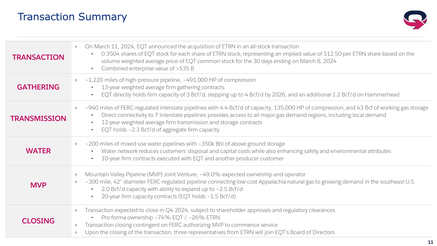 10 $0 $2 $4 $6 $8 $10 $12 $14 EQT ETRN Retirement Target Total Debt High Confidence Pathways to Achieve Material Debt Reduction Free cash flow, asset sales provide low risk path to $5+ billion of debt repayment post close with full vetting from rating a gen cies PRO FORMA DEBT PROFILE AND TARGETS $ B TARGETING TOTAL DEBT OF $7.5 B 12 – 18 months post - close UNWAVERING COMMITMENT TO INVESTMENT GRADE CREDIT › EQT has fully vetted pro forma balance sheet with S&P, Moody’s, and Fitch to ensure continuance of Investment Grade credit ratings › Pro forma business evaluated on a hybrid upstream / midstream ratings structure that appreciates merits of integrated business model and improved cash flow durability › Identified $5+ B of debt reduction potential via organic free cash flow generation and asset sales LOW RISK DEBT RETIREMENT PATHWAYS ORGANIC DE - LEVERAGING › Integrated business will generate durable free cash flow; 2024E - 2028E cumulative free cash flow expected to be ~2x combined debt due by 2028 providing ample room for natural de - levering › Integration of contractual volume commitments eliminates more than $11 billion of future liabilities › EQT transaction history and balance sheet stewardship underscores our commitment to low absolute debt and leverage ASSET SALES › Highly coveted non - core assets, including regulated assets of ETRN, provide significant coverage and optionality to achieve debt retirement goals › Previously initiated non - operated NE PA asset sale process progressing favorably HIGH CONFIDENCE DE - LEVERAGING PATHWAYS 1. Non - GAAP measure. See appendix for definition. Minimum volume commitments include gathering, water and MVP.