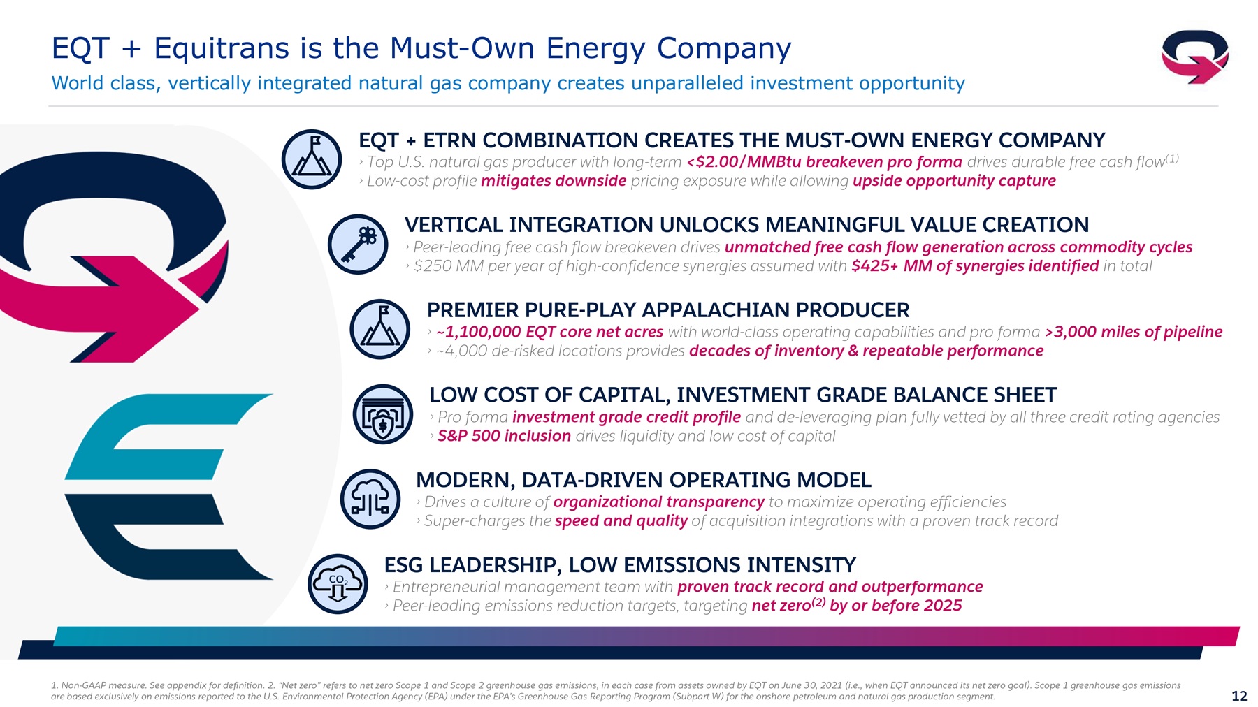12 ESG LEADERSHIP, LOW EMISSIONS INTENSITY › Entrepreneurial management team with proven track record and outperformance › Peer - leading emissions reduction targets, targeting net zero (2) by or before 2025 LOW COST OF CAPITAL, INVESTMENT GRADE BALANCE SHEET › Pro forma investment grade credit profile and de - leveraging plan fully vetted by all three credit rating agencies › S&P 500 inclusion drives liquidity and low cost of capital EQT + Equitrans is the Must - Own Energy Company World class, vertically integrated natural gas company creates unparalleled investment opportunity 1. Non - GAAP measure. See appendix for definition. 2 . “Net zero” refers to net zero Scope 1 and Scope 2 greenhouse gas emissions, in each case from assets owned by EQT on June 3 0, 2021 (i.e., when EQT announced its net zero goal). Scope 1 greenhouse gas emissions are based exclusively on emissions reported to the U.S. Environmental Protection Agency (EPA) under the EPA’s Greenhouse Gas Reporting Program (Subpart W) for t he onshore petroleum and natural gas production segment. VERTICAL INTEGRATION UNLOCKS MEANINGFUL VALUE CREATION › Peer - leading free cash flow breakeven drives unmatched free cash flow generation across commodity cycles › $250 MM per year of high - confidence synergies assumed with $425+ MM of synergies identified in total MODERN, DATA - DRIVEN OPERATING MODEL › Drives a culture of organizational transparency to maximize operating efficiencies › Super - charges the speed and quality of acquisition integrations with a proven track record PREMIER PURE - PLAY APPALACHIAN PRODUCER › ~1,100,000 EQT core net acres with world - class operating capabilities and pro forma >3,000 miles of pipeline › ~4,000 de - risked locations provides decades of inventory & repeatable performance EQT + ETRN COMBINATION CREATES THE MUST - OWN ENERGY COMPANY › Top U.S. natural gas producer with long - term <$2.00/MMBtu breakeven pro forma drives durable free cash flow (1) › Low - cost profile mitigates downside pricing exposure while allowing upside opportunity capture