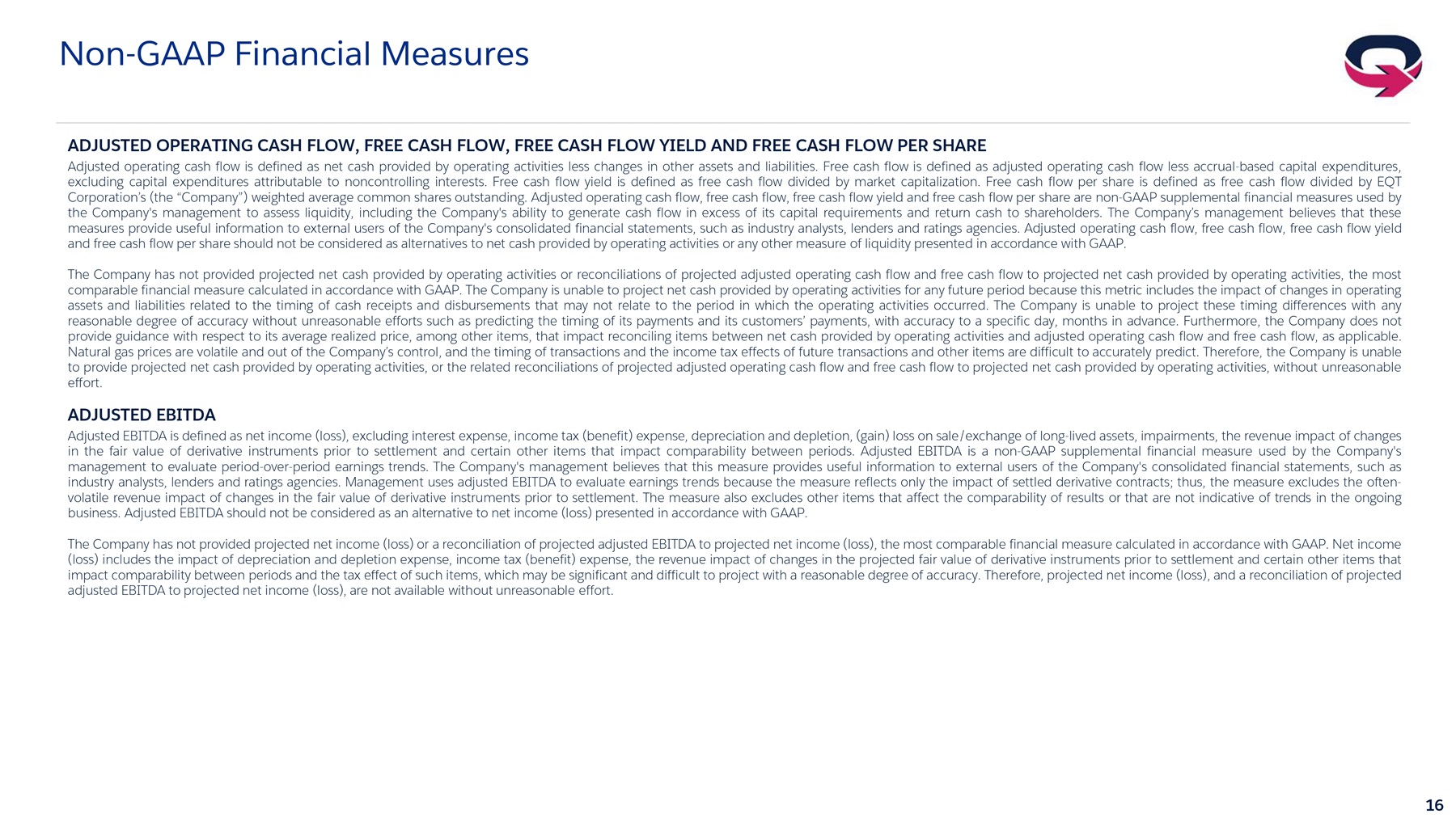 16 Non - GAAP Financial Measures ADJUSTED OPERATING CASH FLOW, FREE CASH FLOW, FREE CASH FLOW YIELD AND FREE CASH FLOW PER SHARE Adjusted operating cash flow is defined as net cash provided by operating activities less changes in other assets and liabilities . Free cash flow is defined as adjusted operating cash flow less accrual - based capital expenditures, excluding capital expenditures attributable to noncontrolling interests . Free cash flow yield is defined as free cash flow divided by market capitalization . Free cash flow per share is defined as free cash flow divided by EQT Corporation’s (the “Company”) weighted average common shares outstanding . Adjusted operating cash flow, free cash flow, free cash flow yield and free cash flow per share are non - GAAP supplemental financial measures used by the Company's management to assess liquidity, including the Company's ability to generate cash flow in excess of its capital requirements and return cash to shareholders . The Company’s management believes that these measures provide useful information to external users of the Company's consolidated financial statements, such as industry analysts, lenders and ratings agencies . Adjusted operating cash flow, free cash flow, free cash flow yield and free cash flow per share should not be considered as alternatives to net cash provided by operating activities or any other measure of liquidity presented in accordance with GAAP . The Company has not provided projected net cash provided by operating activities or reconciliations of projected adjusted operating cash flow and free cash flow to projected net cash provided by operating activities, the most comparable financial measure calculated in accordance with GAAP . The Company is unable to project net cash provided by operating activities for any future period because this metric includes the impact of changes in operating assets and liabilities related to the timing of cash receipts and disbursements that may not relate to the period in which the operating activities occurred . The Company is unable to project these timing differences with any reasonable degree of accuracy without unreasonable efforts such as predicting the timing of its payments and its customers’ payments, with accuracy to a specific day, months in advance . Furthermore, the Company does not provide guidance with respect to its average realized price, among other items, that impact reconciling items between net cash provided by operating activities and adjusted operating cash flow and free cash flow, as applicable . Natural gas prices are volatile and out of the Company’s control, and the timing of transactions and the income tax effects of future transactions and other items are difficult to accurately predict . Therefore, the Company is unable to provide projected net cash provided by operating activities, or the related reconciliations of projected adjusted operating cash flow and free cash flow to projected net cash provided by operating activities, without unreasonable effort . ADJUSTED EBITDA Adjusted EBITDA is defined as net income (loss), excluding interest expense, income tax (benefit) expense, depreciation and depletion, (gain) loss on sale/exchange of long - lived assets, impairments, the revenue impact of changes in the fair value of derivative instruments prior to settlement and certain other items that impact comparability between periods . Adjusted EBITDA is a non - GAAP supplemental financial measure used by the Company's management to evaluate period - over - period earnings trends . The Company's management believes that this measure provides useful information to external users of the Company's consolidated financial statements, such as industry analysts, lenders and ratings agencies . Management uses adjusted EBITDA to evaluate earnings trends because the measure reflects only the impact of settled derivative contracts ; thus, the measure excludes the often - volatile revenue impact of changes in the fair value of derivative instruments prior to settlement . The measure also excludes other items that affect the comparability of results or that are not indicative of trends in the ongoing business . Adjusted EBITDA should not be considered as an alternative to net income (loss) presented in accordance with GAAP . The Company has not provided projected net income (loss) or a reconciliation of projected adjusted EBITDA to projected net income (loss), the most comparable financial measure calculated in accordance with GAAP . Net income (loss) includes the impact of depreciation and depletion expense, income tax (benefit) expense, the revenue impact of changes in the projected fair value of derivative instruments prior to settlement and certain other items that impact comparability between periods and the tax effect of such items, which may be significant and difficult to project with a reasonable degree of accuracy . Therefore, projected net income (loss), and a reconciliation of projected adjusted EBITDA to projected net income (loss), are not available without unreasonable effort .