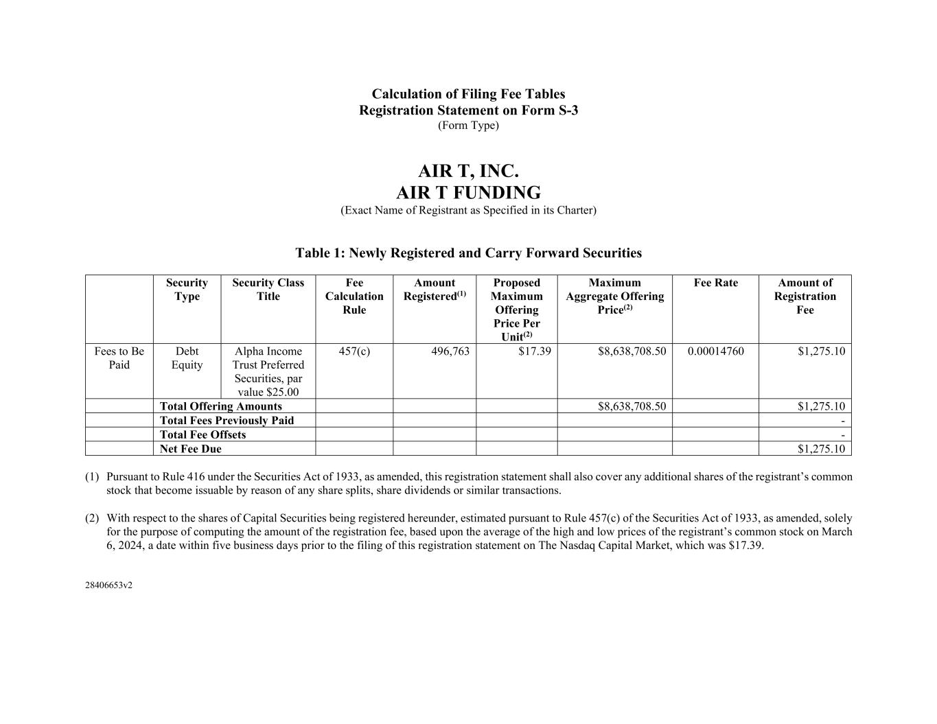 Pursuant to the requirements of the Securities Act of 1933, as amended, Air T Funding, certifies that it has reasonable grounds to believe that it meets all of the requirements for filing on Form S-3 and has duly caused this registration statement to be signed on its behalf by the undersigned, thereunto duly authorized, in the city of Minneapolis, State of Minnesota, on March 12, 2024.