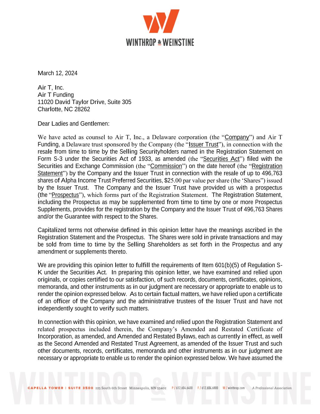 As used in this prospectus, the terms “Company,” “we,” “our,” “ours” “Air T” and “us” refer Air T, Inc., a Delaware corporation and its subsidiaries (unless the context indicates another meaning). Air T Funding is referred to as the “Issuer Trust” or “Air T Funding”, and is a Delaware statutory trust which issued to the Selling Securityholders the Capital Securities representing preferred undivided beneficial interests in the assets of the Issuer Trust, as part of the 2023 Private Placement.