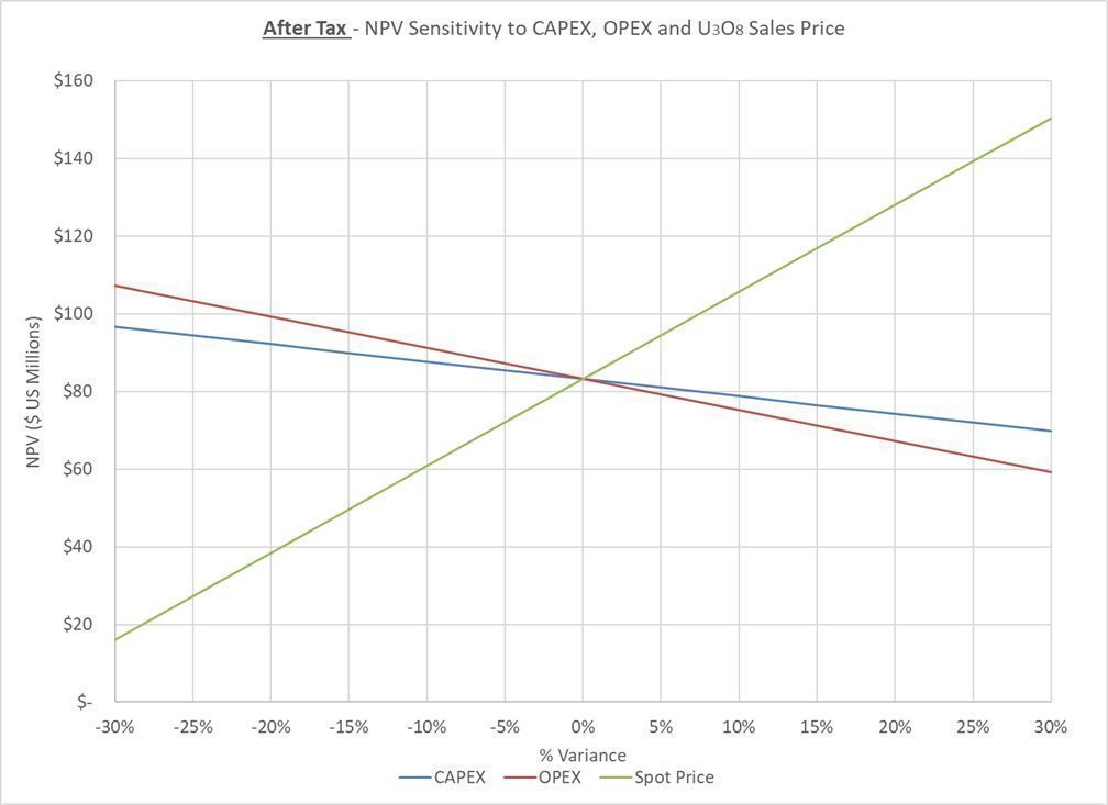 The Project is sensitive to changes in the price of uranium as shown in Figures 22 and 23. A five percent change in the estimated commodity price results in a $16.0 million change to the before tax NPV and $11.2 million to the after tax NPV at a discount rate of eight percent. This analysis is based on a variable commodity price per pound. The Project is also somewhat sensitive to changes in OPEX costs. A five percent variation in OPEX results in a $7.7 million variation in the before tax NPV and $4.0 million to the after tax NPV. The Project is least sensitive to changes in CAPEX. A five percent variation in CAPEX results in a $1.9 million variation in the before tax NPV and a $2.2 million variation in the after tax NPV.
