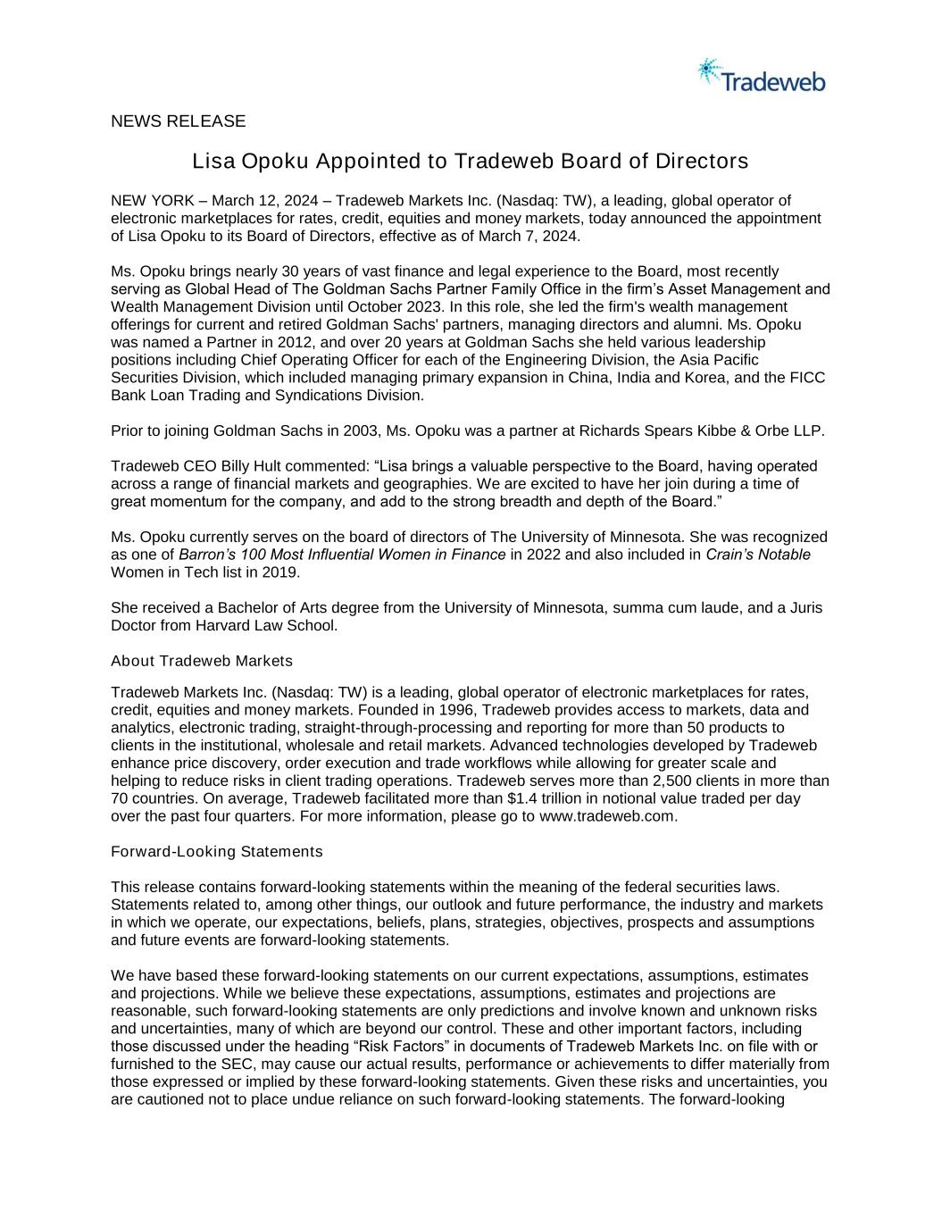 NEWS RELEASE Lisa Opoku Appointed to Tradeweb Board of Directors NEW YORK – March 12, 2024 – Tradeweb Markets Inc. (Nasdaq: TW), a leading, global operator of electronic marketplaces for rates, credit, equities and money markets, today announced the appointment of Lisa Opoku to its Board of Directors, effective as of March 7, 2024. Ms. Opoku brings nearly 30 years of vast finance and legal experience to the Board, most recently serving as Global Head of The Goldman Sachs Partner Family Office in the firm’s Asset Management and Wealth Management Division until October 2023. In this role, she led the firm's wealth management offerings for current and retired Goldman Sachs' partners, managing directors and alumni. Ms. Opoku was named a Partner in 2012, and over 20 years at Goldman Sachs she held various leadership positions including Chief Operating Officer for each of the Engineering Division, the Asia Pacific Securities Division, which included managing primary expansion in China, India and Korea, and the FICC Bank Loan Trading and Syndications Division. Prior to joining Goldman Sachs in 2003, Ms. Opoku was a partner at Richards Spears Kibbe & Orbe LLP. Tradeweb CEO Billy Hult commented: “Lisa brings a valuable perspective to the Board, having operated across a range of financial markets and geographies. We are excited to have her join during a time of great momentum for the company, and add to the strong breadth and depth of the Board.” Ms. Opoku currently serves on the board of directors of The University of Minnesota. She was recognized as one of Barron’s 100 Most Influential Women in Finance in 2022 and also included in Crain’s Notable Women in Tech list in 2019. She received a Bachelor of Arts degree from the University of Minnesota, summa cum laude, and a Juris Doctor from Harvard Law School. About Tradeweb Markets Tradeweb Markets Inc. (Nasdaq: TW) is a leading, global operator of electronic marketplaces for rates, credit, equities and money markets. Founded in 1996, Tradeweb provides access to markets, data and analytics, electronic trading, straight-through-processing and reporting for more than 50 products to clients in the institutional, wholesale and retail markets. Advanced technologies developed by Tradeweb enhance price discovery, order execution and trade workflows while allowing for greater scale and helping to reduce risks in client trading operations. Tradeweb serves more than 2,500 clients in more than 70 countries. On average, Tradeweb facilitated more than $1.4 trillion in notional value traded per day over the past four quarters. For more information, please go to www.tradeweb.com. Forward-Looking Statements This release contains forward-looking statements within the meaning of the federal securities laws. Statements related to, among other things, our outlook and future performance, the industry and markets in which we operate, our expectations, beliefs, plans, strategies, objectives, prospects and assumptions and future events are forward-looking statements. We have based these forward-looking statements on our current expectations, assumptions, estimates and projections. While we believe these expectations, assumptions, estimates and projections are reasonable, such forward-looking statements are only predictions and involve known and unknown risks and uncertainties, many of which are beyond our control. These and other important factors, including those discussed under the heading “Risk Factors” in documents of Tradeweb Markets Inc. on file with or furnished to the SEC, may cause our actual results, performance or achievements to differ materially from those expressed or implied by these forward-looking statements. Given these risks and uncertainties, you are cautioned not to place undue reliance on such forward-looking statements. The forward-looking