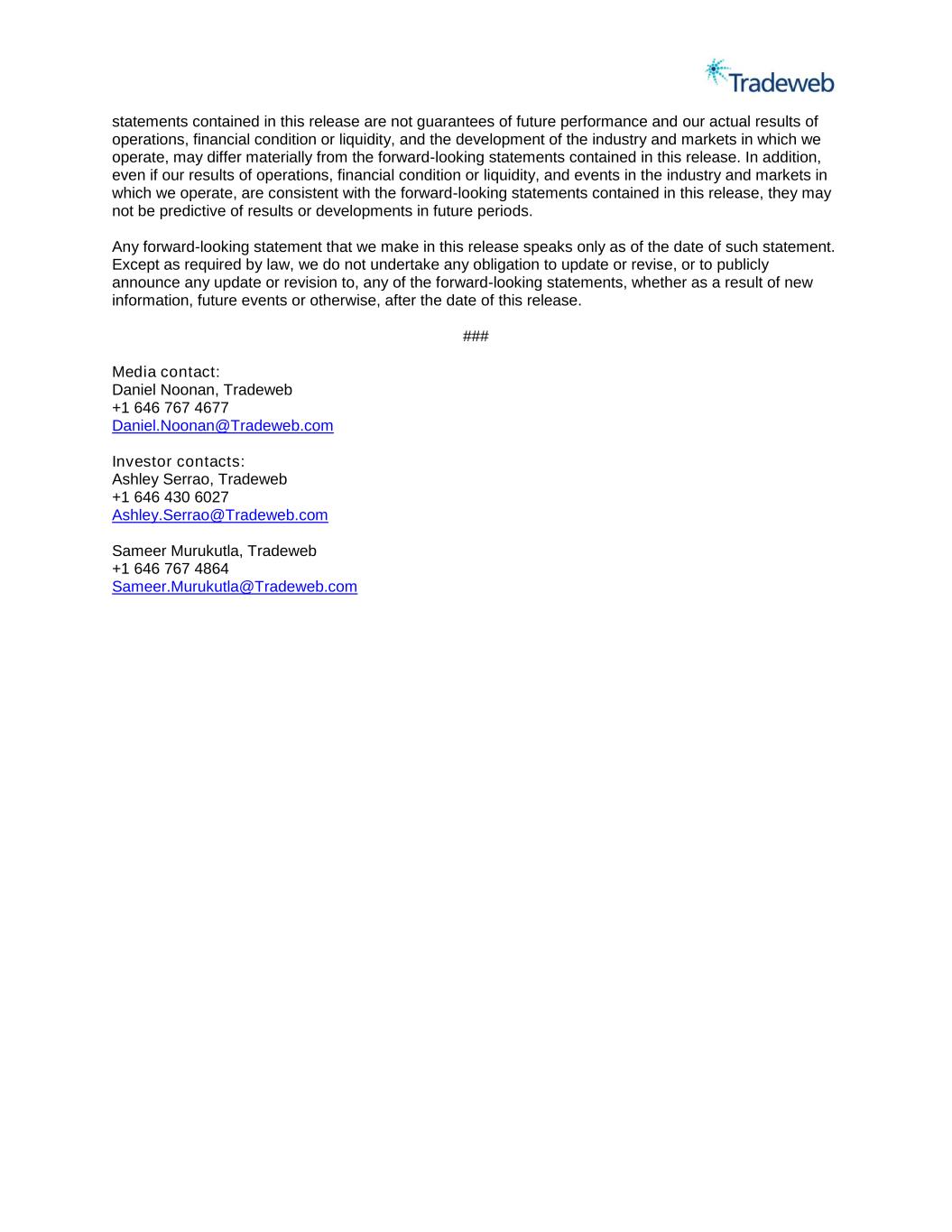 statements contained in this release are not guarantees of future performance and our actual results of operations, financial condition or liquidity, and the development of the industry and markets in which we operate, may differ materially from the forward-looking statements contained in this release. In addition, even if our results of operations, financial condition or liquidity, and events in the industry and markets in which we operate, are consistent with the forward-looking statements contained in this release, they may not be predictive of results or developments in future periods. Any forward-looking statement that we make in this release speaks only as of the date of such statement. Except as required by law, we do not undertake any obligation to update or revise, or to publicly announce any update or revision to, any of the forward-looking statements, whether as a result of new information, future events or otherwise, after the date of this release. ### Media contact: Daniel Noonan, Tradeweb +1 646 767 4677 Daniel.Noonan@Tradeweb.com Investor contacts: Ashley Serrao, Tradeweb +1 646 430 6027 Ashley.Serrao@Tradeweb.com Sameer Murukutla, Tradeweb +1 646 767 4864 Sameer.Murukutla@Tradeweb.com