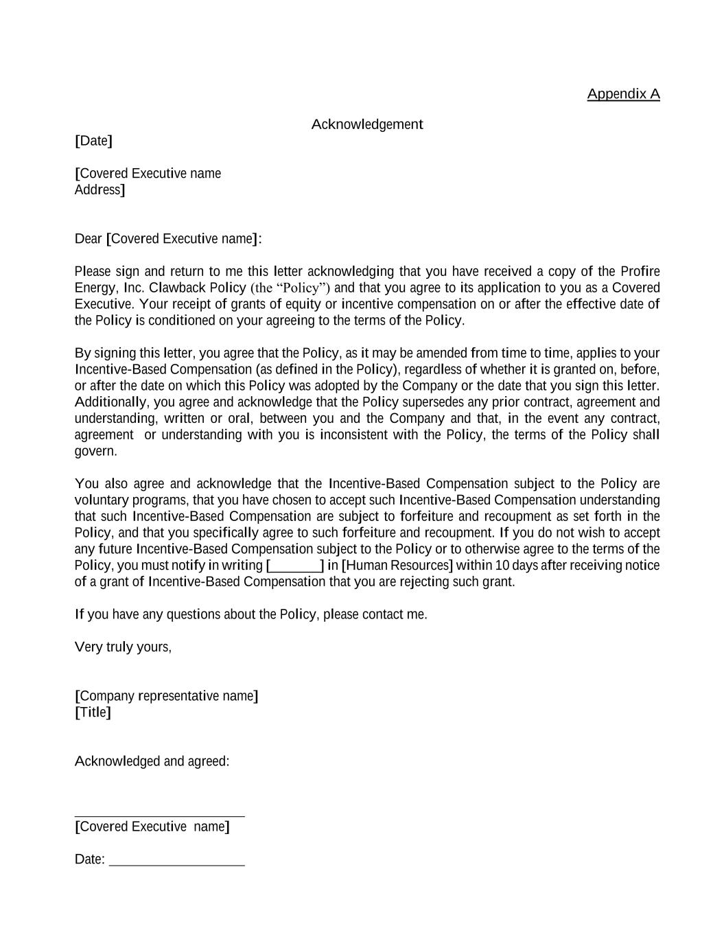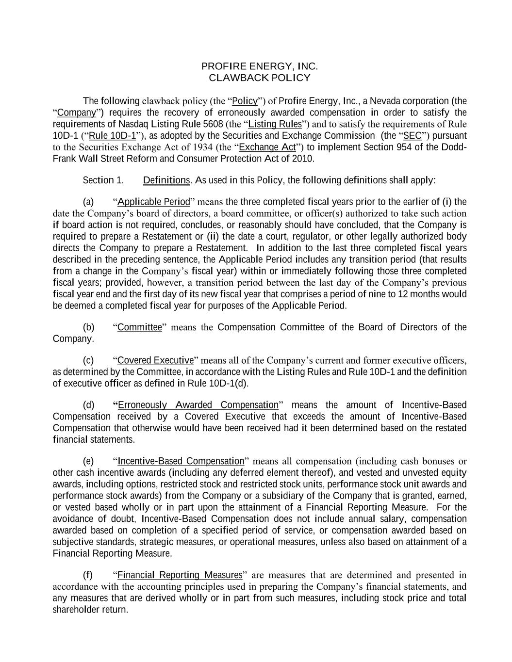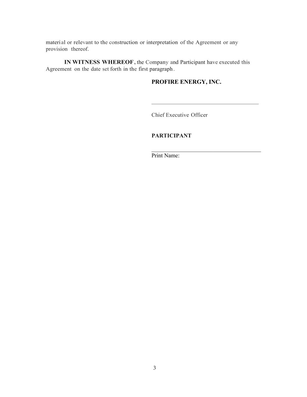 3 material or relevant to the construction or interpretation of the Agreement or any provision thereof. IN WITNESS WHEREOF, the Company and Participant have executed this Agreement on the date set forth in the first paragraph . PROFIRE ENERGY, INC. _____________________________________ Chief Executive Officer PARTICIPANT ______________________________________ Print Name: