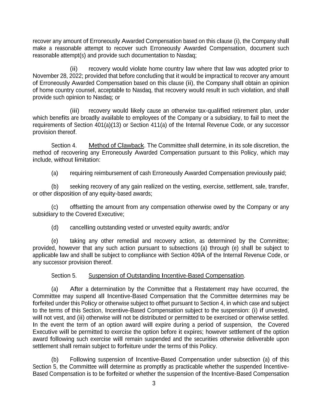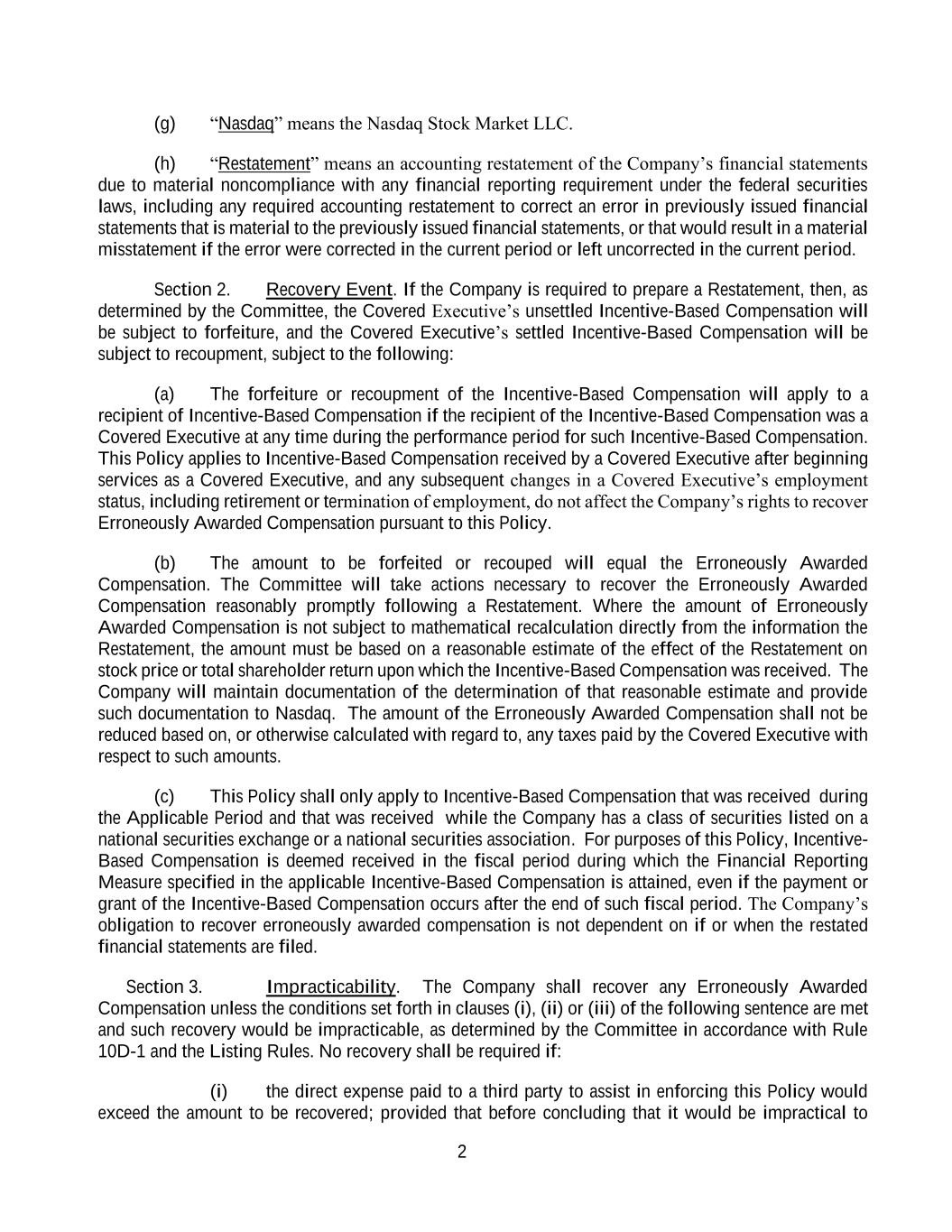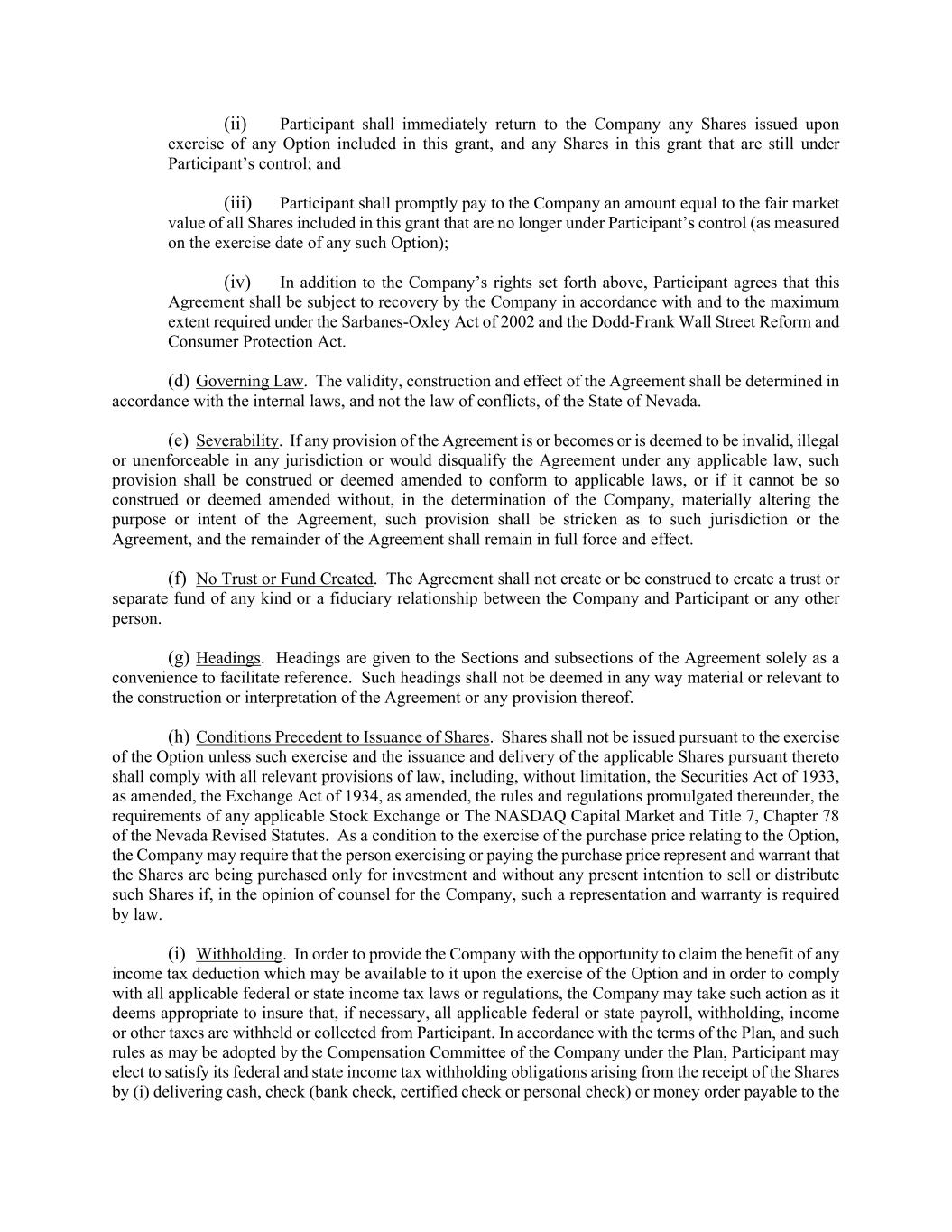 (ii) Participant shall immediately return to the Company any Shares issued upon exercise of any Option included in this grant, and any Shares in this grant that are still under Participant’s control; and (iii) Participant shall promptly pay to the Company an amount equal to the fair market value of all Shares included in this grant that are no longer under Participant’s control (as measured on the exercise date of any such Option); (iv) In addition to the Company’s rights set forth above, Participant agrees that this Agreement shall be subject to recovery by the Company in accordance with and to the maximum extent required under the Sarbanes-Oxley Act of 2002 and the Dodd-Frank Wall Street Reform and Consumer Protection Act. (d) Governing Law. The validity, construction and effect of the Agreement shall be determined in accordance with the internal laws, and not the law of conflicts, of the State of Nevada. (e) Severability. If any provision of the Agreement is or becomes or is deemed to be invalid, illegal or unenforceable in any jurisdiction or would disqualify the Agreement under any applicable law, such provision shall be construed or deemed amended to conform to applicable laws, or if it cannot be so construed or deemed amended without, in the determination of the Company, materially altering the purpose or intent of the Agreement, such provision shall be stricken as to such jurisdiction or the Agreement, and the remainder of the Agreement shall remain in full force and effect. (f) No Trust or Fund Created. The Agreement shall not create or be construed to create a trust or separate fund of any kind or a fiduciary relationship between the Company and Participant or any other person. (g) Headings. Headings are given to the Sections and subsections of the Agreement solely as a convenience to facilitate reference. Such headings shall not be deemed in any way material or relevant to the construction or interpretation of the Agreement or any provision thereof. (h) Conditions Precedent to Issuance of Shares. Shares shall not be issued pursuant to the exercise of the Option unless such exercise and the issuance and delivery of the applicable Shares pursuant thereto shall comply with all relevant provisions of law, including, without limitation, the Securities Act of 1933, as amended, the Exchange Act of 1934, as amended, the rules and regulations promulgated thereunder, the requirements of any applicable Stock Exchange or The NASDAQ Capital Market and Title 7, Chapter 78 of the Nevada Revised Statutes. As a condition to the exercise of the purchase price relating to the Option, the Company may require that the person exercising or paying the purchase price represent and warrant that the Shares are being purchased only for investment and without any present intention to sell or distribute such Shares if, in the opinion of counsel for the Company, such a representation and warranty is required by law. (i) Withholding. In order to provide the Company with the opportunity to claim the benefit of any income tax deduction which may be available to it upon the exercise of the Option and in order to comply with all applicable federal or state income tax laws or regulations, the Company may take such action as it deems appropriate to insure that, if necessary, all applicable federal or state payroll, withholding, income or other taxes are withheld or collected from Participant. In accordance with the terms of the Plan, and such rules as may be adopted by the Compensation Committee of the Company under the Plan, Participant may elect to satisfy its federal and state income tax withholding obligations arising from the receipt of the Shares by (i) delivering cash, check (bank check, certified check or personal check) or money order payable to the