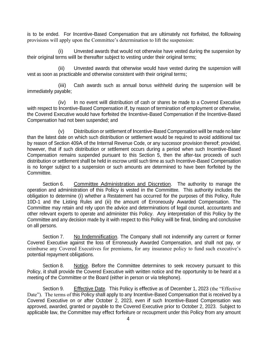 96151691.2 0059466- 00001 4 754573255.2 (h) No Trust or Fund Created. Neither the Plan nor the Agreement shall create or be construed to create a trust or separate fund of any kind or a fiduciary relationship between the Company or any Affiliate and Participant or any other person. (i) Section 409A Provisions. The payment of Shares under this Agreement are intended to be exempt from the application of section 409A of the Internal Revenue Code, as amended (“Section 409A”) by reason of the short-term deferral exemption set forth in Treasury Regulation §1.409A-1(b)(4). Notwithstanding anything in the Plan or this Agreement to the contrary, to the extent that any amount or benefit hereunder that constitutes “deferred compensation” to the Participant under section 409A of the Internal Revenue Code, as amended (“Section 409A”) and applicable guidance thereunder is otherwise payable or distributable to the Participant under the Plan or this Agreement solely due to the Participant’s disability or “separation from service” (as such term is defined under Section 409A), such amount or benefit will not be payable or distributable to the Participant by reason of such circumstance unless the Committee determines in good faith that (i) the circumstances giving rise to such disability or separation from service meet the definition of disability, or separation from service, as the case may be, in Section 409A(a)(2)(A) of the Code and applicable final regulations, or (ii) the payment or distribution of such amount or benefit would be exempt from the application of Section 409A by reason of the short-term deferral exemption or otherwise (including, but not limited to, a payment made pursuant to an involuntary separation arrangement that is exempt from Section 409A under the “short-term deferral” exception). Any payment or distribution that otherwise would be made to a Participant who is a specified employee (as determined by the Committee in good faith) on account of separation from service may not be made before the date which is six months after the date of the specified employee’s separation from service (or if earlier, upon the specified employee’s death) unless the payment or distribution is exempt from the application of Section 409A by reason of the short term deferral exemption or otherwise. (j) Headings. Headings are given to the Sections and subsections of the Agreement solely as a convenience to facilitate reference. Such headings shall not be deemed in any way material or relevant to the construction or interpretation of the Agreement or any provision thereof. (k) Securities Matters. The Company shall not be required, and shall not have any liability for failure, to deliver Shares until the requirements of any federal or state securities or other laws, rules or regulations (including the rules of any securities exchange) as may be determined by the Company to be applicable are satisfied. (l) Consultation with Professional Tax and Investment Advisors. The Participant acknowledges that the grant, exercise, vesting or any payment with respect to this Award, and the sale or other taxable disposition of the Shares acquired pursuant to the exercise thereof, may have tax consequences pursuant to the Internal Revenue Code of 1986, as amended, or under local, state or international tax laws. The Participant further acknowledges that the Participant is relying solely and exclusively on the Participant’s own professional tax and investment advisors with respect to any and all such matters (and is not relying, in any manner, on the Company or any of its employees or representatives). Finally, the Participant understands and agrees that any and all tax consequences resulting from the Award and its grant, exercise, vesting or any payment with respect thereto, and the sale or other taxable disposition of the Shares acquired