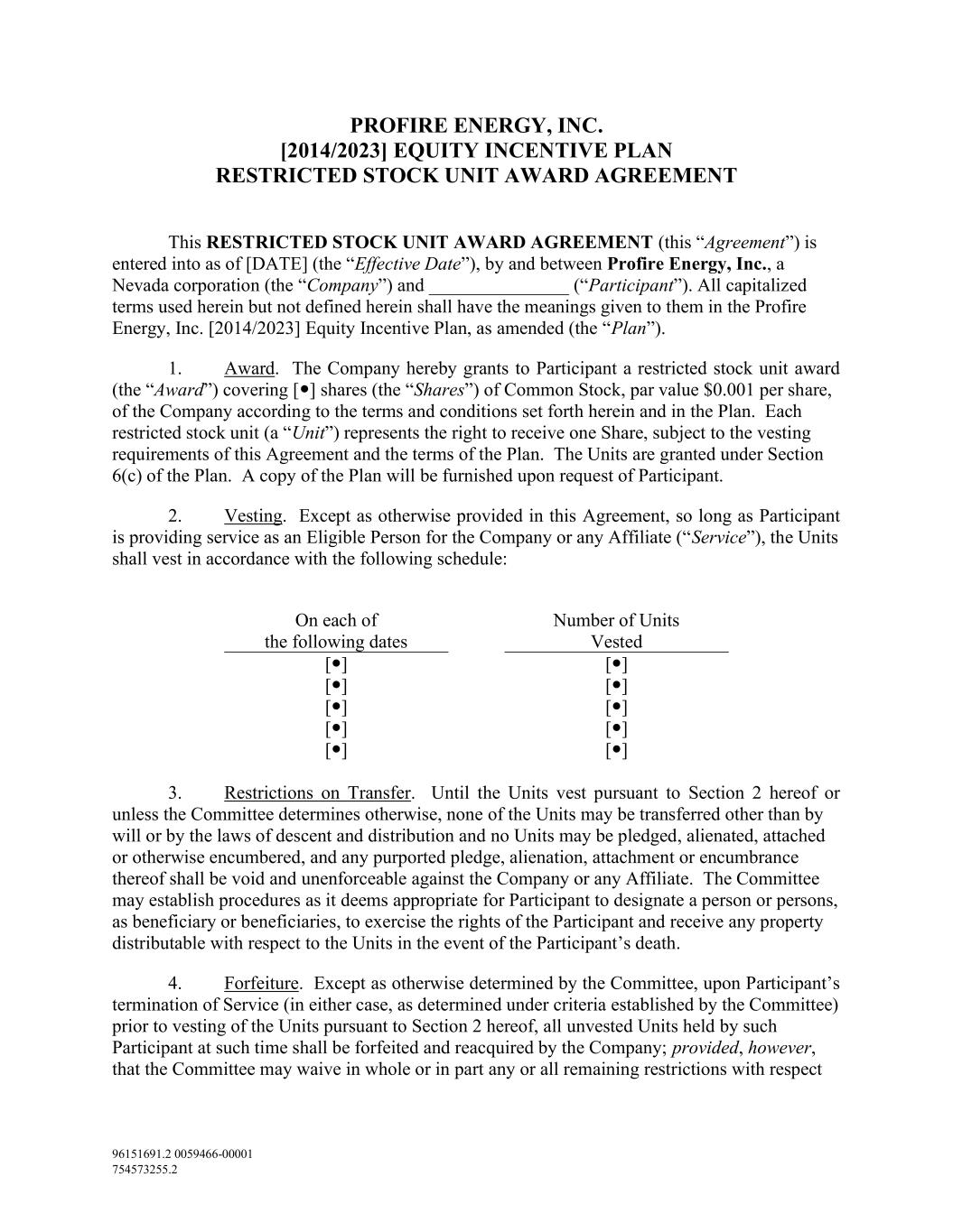 96151691.2 0059466-00001 754573255.2 PROFIRE ENERGY, INC. [2014/2023] EQUITY INCENTIVE PLAN RESTRICTED STOCK UNIT AWARD AGREEMENT This RESTRICTED STOCK UNIT AWARD AGREEMENT (this “Agreement”) is entered into as of [DATE] (the “Effective Date”), by and between Profire Energy, Inc., a Nevada corporation (the “Company”) and _______________ (“Participant”). All capitalized terms used herein but not defined herein shall have the meanings given to them in the Profire Energy, Inc. [2014/2023] Equity Incentive Plan, as amended (the “Plan”). 1. Award. The Company hereby grants to Participant a restricted stock unit award (the “Award”) covering [] shares (the “Shares”) of Common Stock, par value $0.001 per share, of the Company according to the terms and conditions set forth herein and in the Plan. Each restricted stock unit (a “Unit”) represents the right to receive one Share, subject to the vesting requirements of this Agreement and the terms of the Plan. The Units are granted under Section 6(c) of the Plan. A copy of the Plan will be furnished upon request of Participant. 2. Vesting. Except as otherwise provided in this Agreement, so long as Participant is providing service as an Eligible Person for the Company or any Affiliate (“Service”), the Units shall vest in accordance with the following schedule: On each of the following dates Number of Units Vested [] [] [] [] [] [] [] [] [] [] 3. Restrictions on Transfer. Until the Units vest pursuant to Section 2 hereof or unless the Committee determines otherwise, none of the Units may be transferred other than by will or by the laws of descent and distribution and no Units may be pledged, alienated, attached or otherwise encumbered, and any purported pledge, alienation, attachment or encumbrance thereof shall be void and unenforceable against the Company or any Affiliate. The Committee may establish procedures as it deems appropriate for Participant to designate a person or persons, as beneficiary or beneficiaries, to exercise the rights of the Participant and receive any property distributable with respect to the Units in the event of the Participant’s death. 4. Forfeiture. Except as otherwise determined by the Committee, upon Participant’s termination of Service (in either case, as determined under criteria established by the Committee) prior to vesting of the Units pursuant to Section 2 hereof, all unvested Units held by such Participant at such time shall be forfeited and reacquired by the Company; provided, however, that the Committee may waive in whole or in part any or all remaining restrictions with respect