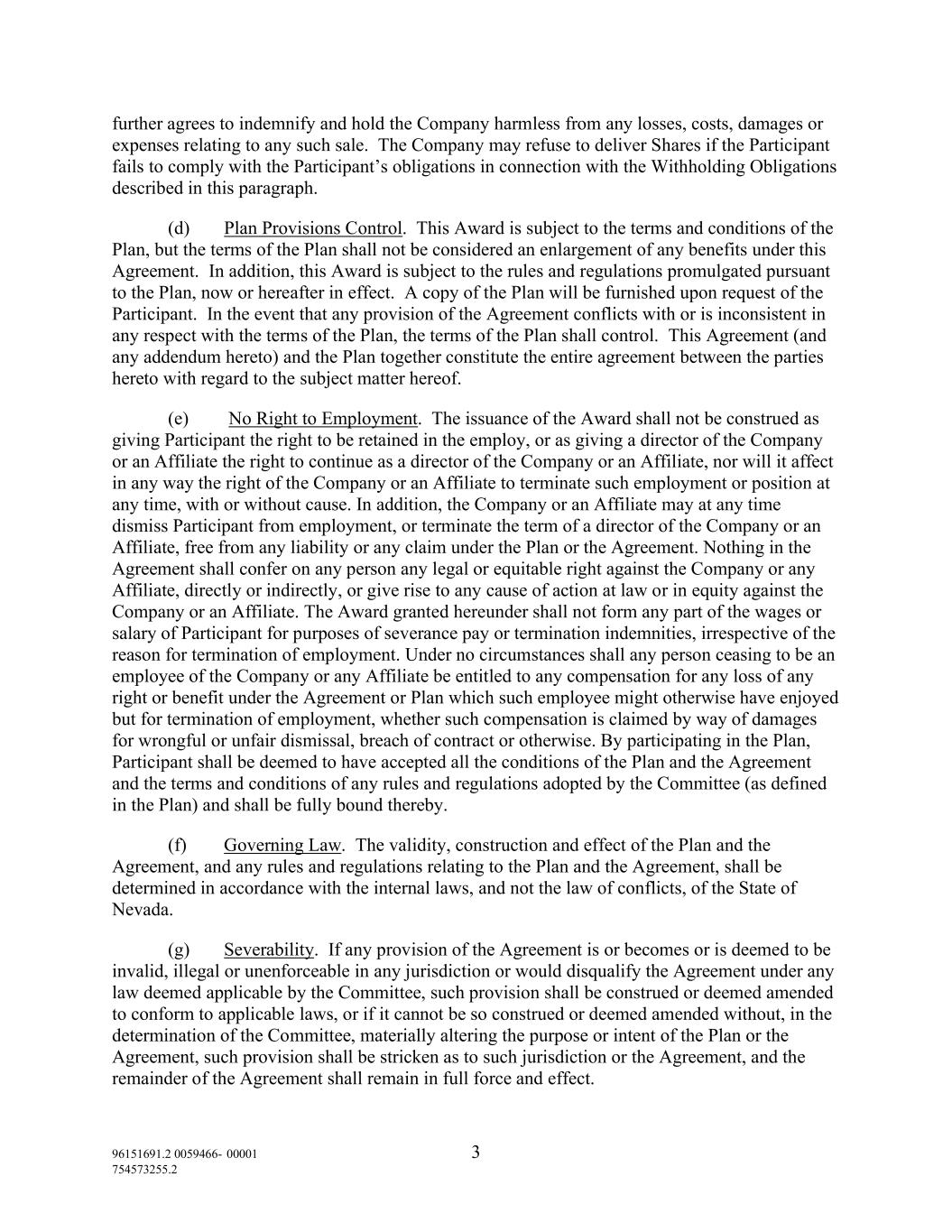 96151691.2 0059466- 00001 3 754573255.2 further agrees to indemnify and hold the Company harmless from any losses, costs, damages or expenses relating to any such sale. The Company may refuse to deliver Shares if the Participant fails to comply with the Participant’s obligations in connection with the Withholding Obligations described in this paragraph. (d) Plan Provisions Control. This Award is subject to the terms and conditions of the Plan, but the terms of the Plan shall not be considered an enlargement of any benefits under this Agreement. In addition, this Award is subject to the rules and regulations promulgated pursuant to the Plan, now or hereafter in effect. A copy of the Plan will be furnished upon request of the Participant. In the event that any provision of the Agreement conflicts with or is inconsistent in any respect with the terms of the Plan, the terms of the Plan shall control. This Agreement (and any addendum hereto) and the Plan together constitute the entire agreement between the parties hereto with regard to the subject matter hereof. (e) No Right to Employment. The issuance of the Award shall not be construed as giving Participant the right to be retained in the employ, or as giving a director of the Company or an Affiliate the right to continue as a director of the Company or an Affiliate, nor will it affect in any way the right of the Company or an Affiliate to terminate such employment or position at any time, with or without cause. In addition, the Company or an Affiliate may at any time dismiss Participant from employment, or terminate the term of a director of the Company or an Affiliate, free from any liability or any claim under the Plan or the Agreement. Nothing in the Agreement shall confer on any person any legal or equitable right against the Company or any Affiliate, directly or indirectly, or give rise to any cause of action at law or in equity against the Company or an Affiliate. The Award granted hereunder shall not form any part of the wages or salary of Participant for purposes of severance pay or termination indemnities, irrespective of the reason for termination of employment. Under no circumstances shall any person ceasing to be an employee of the Company or any Affiliate be entitled to any compensation for any loss of any right or benefit under the Agreement or Plan which such employee might otherwise have enjoyed but for termination of employment, whether such compensation is claimed by way of damages for wrongful or unfair dismissal, breach of contract or otherwise. By participating in the Plan, Participant shall be deemed to have accepted all the conditions of the Plan and the Agreement and the terms and conditions of any rules and regulations adopted by the Committee (as defined in the Plan) and shall be fully bound thereby. (f) Governing Law. The validity, construction and effect of the Plan and the Agreement, and any rules and regulations relating to the Plan and the Agreement, shall be determined in accordance with the internal laws, and not the law of conflicts, of the State of Nevada. (g) Severability. If any provision of the Agreement is or becomes or is deemed to be invalid, illegal or unenforceable in any jurisdiction or would disqualify the Agreement under any law deemed applicable by the Committee, such provision shall be construed or deemed amended to conform to applicable laws, or if it cannot be so construed or deemed amended without, in the determination of the Committee, materially altering the purpose or intent of the Plan or the Agreement, such provision shall be stricken as to such jurisdiction or the Agreement, and the remainder of the Agreement shall remain in full force and effect.