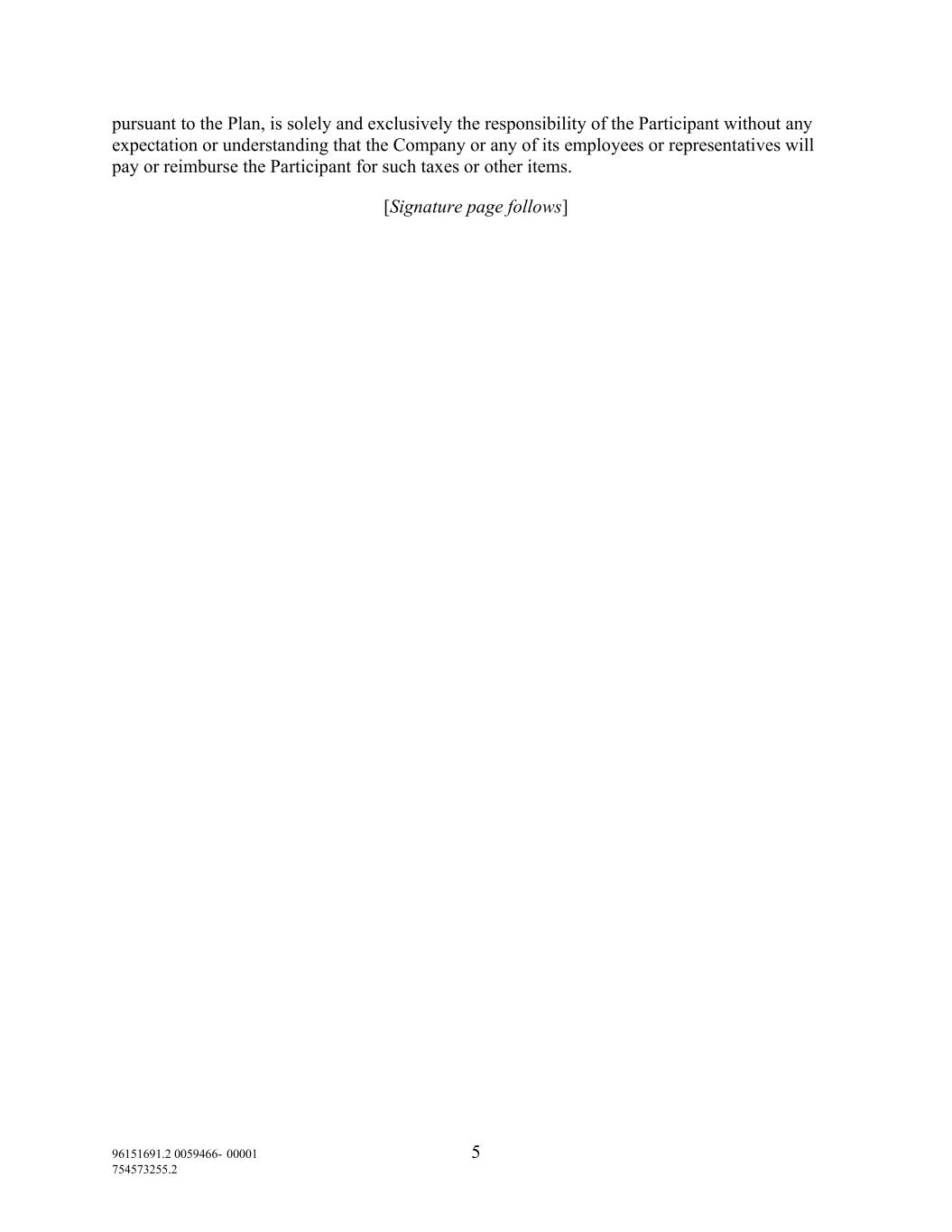 96151691.2 0059466- 00001 5 754573255.2 pursuant to the Plan, is solely and exclusively the responsibility of the Participant without any expectation or understanding that the Company or any of its employees or representatives will pay or reimburse the Participant for such taxes or other items. [Signature page follows]