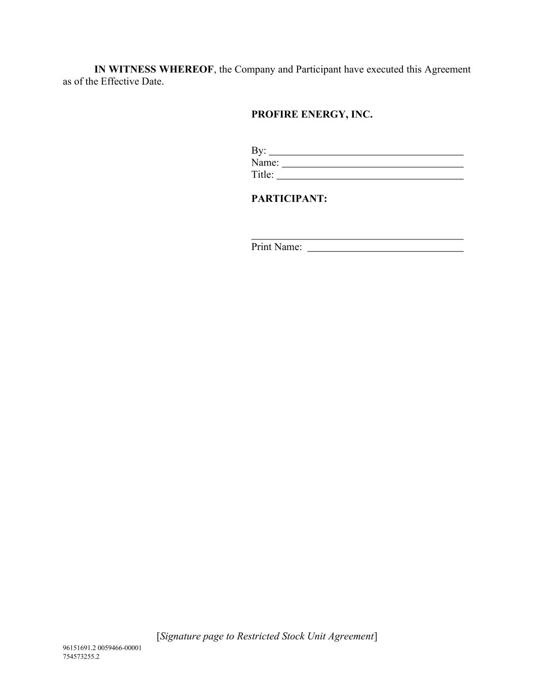 [Signature page to Restricted Stock Unit Agreement] 96151691.2 0059466-00001 754573255.2 IN WITNESS WHEREOF, the Company and Participant have executed this Agreement as of the Effective Date. PROFIRE ENERGY, INC. By: Name: Title: PARTICIPANT: Print Name: