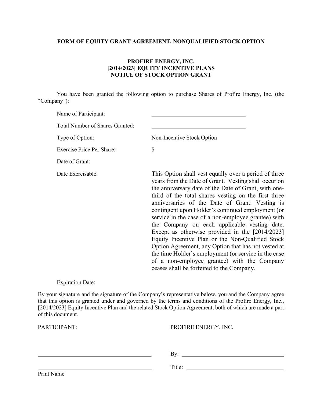 FORM OF EQUITY GRANT AGREEMENT, NONQUALIFIED STOCK OPTION PROFIRE ENERGY, INC. [2014/2023] EQUITY INCENTIVE PLANS NOTICE OF STOCK OPTION GRANT You have been granted the following option to purchase Shares of Profire Energy, Inc. (the “Company”): Name of Participant: Total Number of Shares Granted: Type of Option: Non-Incentive Stock Option Exercise Price Per Share: $ Date of Grant: Date Exercisable: This Option shall vest equally over a period of three years from the Date of Grant. Vesting shall occur on the anniversary date of the Date of Grant, with one- third of the total shares vesting on the first three anniversaries of the Date of Grant. Vesting is contingent upon Holder’s continued employment (or service in the case of a non-employee grantee) with the Company on each applicable vesting date. Except as otherwise provided in the [2014/2023] Equity Incentive Plan or the Non-Qualified Stock Option Agreement, any Option that has not vested at the time Holder’s employment (or service in the case of a non-employee grantee) with the Company ceases shall be forfeited to the Company. Expiration Date: By your signature and the signature of the Company’s representative below, you and the Company agree that this option is granted under and governed by the terms and conditions of the Profire Energy, Inc., [2014/2023] Equity Incentive Plan and the related Stock Option Agreement, both of which are made a part of this document. PARTICIPANT: PROFIRE ENERGY, INC. By: Title: Print Name