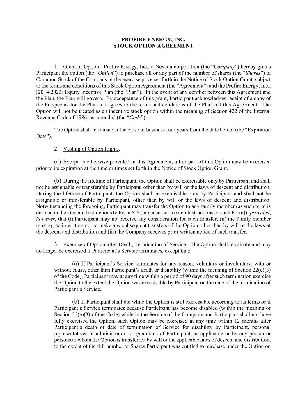 PROFIRE ENERGY, INC. STOCK OPTION AGREEMENT 1. Grant of Option. Profire Energy, Inc., a Nevada corporation (the “Company”) hereby grants Participant the option (the “Option”) to purchase all or any part of the number of shares (the “Shares”) of Common Stock of the Company at the exercise price set forth in the Notice of Stock Option Grant, subject to the terms and conditions of this Stock Option Agreement (the “Agreement”) and the Profire Energy, Inc., [2014/2023] Equity Incentive Plan (the “Plan”). In the event of any conflict between this Agreement and the Plan, the Plan will govern. By acceptance of this grant, Participant acknowledges receipt of a copy of the Prospectus for the Plan and agrees to the terms and conditions of the Plan and this Agreement. The Option will not be treated as an incentive stock option within the meaning of Section 422 of the Internal Revenue Code of 1986, as amended (the “Code”). The Option shall terminate at the close of business four years from the date hereof (the “Expiration Date”). 2. Vesting of Option Rights. (a) Except as otherwise provided in this Agreement, all or part of this Option may be exercised prior to its expiration at the time or times set forth in the Notice of Stock Option Grant. (b) During the lifetime of Participant, the Option shall be exercisable only by Participant and shall not be assignable or transferable by Participant, other than by will or the laws of descent and distribution. During the lifetime of Participant, the Option shall be exercisable only by Participant and shall not be assignable or transferable by Participant, other than by will or the laws of descent and distribution. Notwithstanding the foregoing, Participant may transfer the Option to any family member (as such term is defined in the General Instructions to Form S-8 (or successor to such Instructions or such Form)), provided, however, that (i) Participant may not receive any consideration for such transfer, (ii) the family member must agree in writing not to make any subsequent transfers of the Option other than by will or the laws of the descent and distribution and (iii) the Company receives prior written notice of such transfer. 3. Exercise of Option after Death, Termination of Service. The Option shall terminate and may no longer be exercised if Participant’s Service terminates, except that: (a) If Participant’s Service terminates for any reason, voluntary or involuntary, with or without cause, other than Participant’s death or disability (within the meaning of Section 22(e)(3) of the Code), Participant may at any time within a period of 90 days after such termination exercise the Option to the extent the Option was exercisable by Participant on the date of the termination of Participant’s Service. (b) If Participant shall die while the Option is still exercisable according to its terms or if Participant’s Service terminates because Participant has become disabled (within the meaning of Section 22(e)(3) of the Code) while in the Service of the Company and Participant shall not have fully exercised the Option, such Option may be exercised at any time within 12 months after Participant’s death or date of termination of Service for disability by Participant, personal representatives or administrators or guardians of Participant, as applicable or by any person or persons to whom the Option is transferred by will or the applicable laws of descent and distribution, to the extent of the full number of Shares Participant was entitled to purchase under the Option on