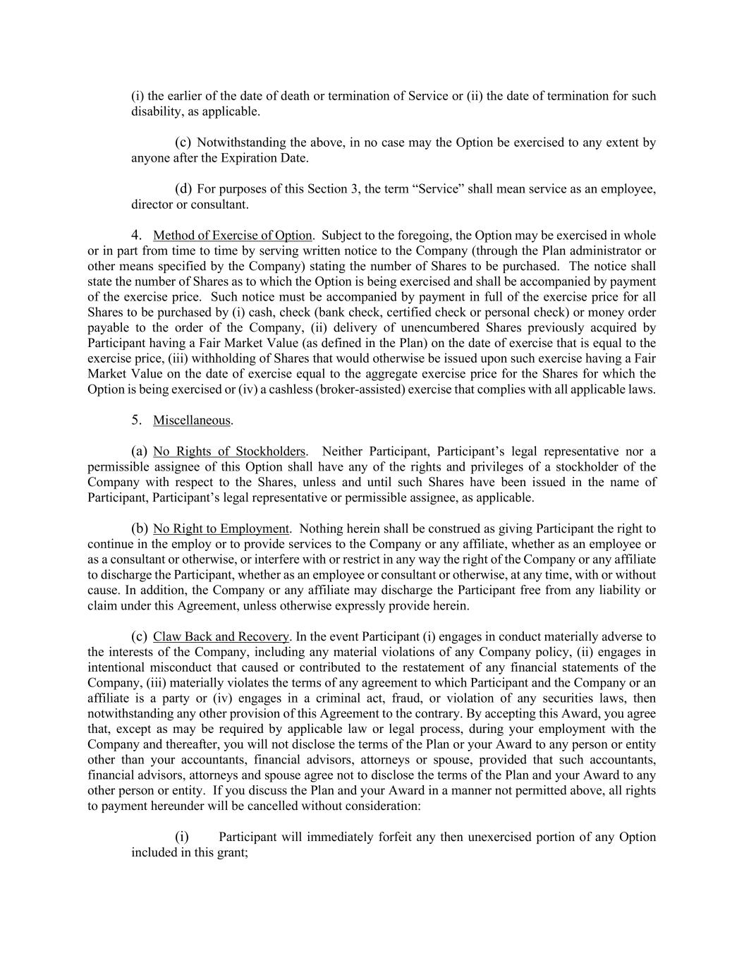 (i) the earlier of the date of death or termination of Service or (ii) the date of termination for such disability, as applicable. (c) Notwithstanding the above, in no case may the Option be exercised to any extent by anyone after the Expiration Date. (d) For purposes of this Section 3, the term “Service” shall mean service as an employee, director or consultant. 4. Method of Exercise of Option. Subject to the foregoing, the Option may be exercised in whole or in part from time to time by serving written notice to the Company (through the Plan administrator or other means specified by the Company) stating the number of Shares to be purchased. The notice shall state the number of Shares as to which the Option is being exercised and shall be accompanied by payment of the exercise price. Such notice must be accompanied by payment in full of the exercise price for all Shares to be purchased by (i) cash, check (bank check, certified check or personal check) or money order payable to the order of the Company, (ii) delivery of unencumbered Shares previously acquired by Participant having a Fair Market Value (as defined in the Plan) on the date of exercise that is equal to the exercise price, (iii) withholding of Shares that would otherwise be issued upon such exercise having a Fair Market Value on the date of exercise equal to the aggregate exercise price for the Shares for which the Option is being exercised or (iv) a cashless (broker-assisted) exercise that complies with all applicable laws. 5. Miscellaneous. (a) No Rights of Stockholders. Neither Participant, Participant’s legal representative nor a permissible assignee of this Option shall have any of the rights and privileges of a stockholder of the Company with respect to the Shares, unless and until such Shares have been issued in the name of Participant, Participant’s legal representative or permissible assignee, as applicable. (b) No Right to Employment. Nothing herein shall be construed as giving Participant the right to continue in the employ or to provide services to the Company or any affiliate, whether as an employee or as a consultant or otherwise, or interfere with or restrict in any way the right of the Company or any affiliate to discharge the Participant, whether as an employee or consultant or otherwise, at any time, with or without cause. In addition, the Company or any affiliate may discharge the Participant free from any liability or claim under this Agreement, unless otherwise expressly provide herein. (c) Claw Back and Recovery. In the event Participant (i) engages in conduct materially adverse to the interests of the Company, including any material violations of any Company policy, (ii) engages in intentional misconduct that caused or contributed to the restatement of any financial statements of the Company, (iii) materially violates the terms of any agreement to which Participant and the Company or an affiliate is a party or (iv) engages in a criminal act, fraud, or violation of any securities laws, then notwithstanding any other provision of this Agreement to the contrary. By accepting this Award, you agree that, except as may be required by applicable law or legal process, during your employment with the Company and thereafter, you will not disclose the terms of the Plan or your Award to any person or entity other than your accountants, financial advisors, attorneys or spouse, provided that such accountants, financial advisors, attorneys and spouse agree not to disclose the terms of the Plan and your Award to any other person or entity. If you discuss the Plan and your Award in a manner not permitted above, all rights to payment hereunder will be cancelled without consideration: (i) Participant will immediately forfeit any then unexercised portion of any Option included in this grant;