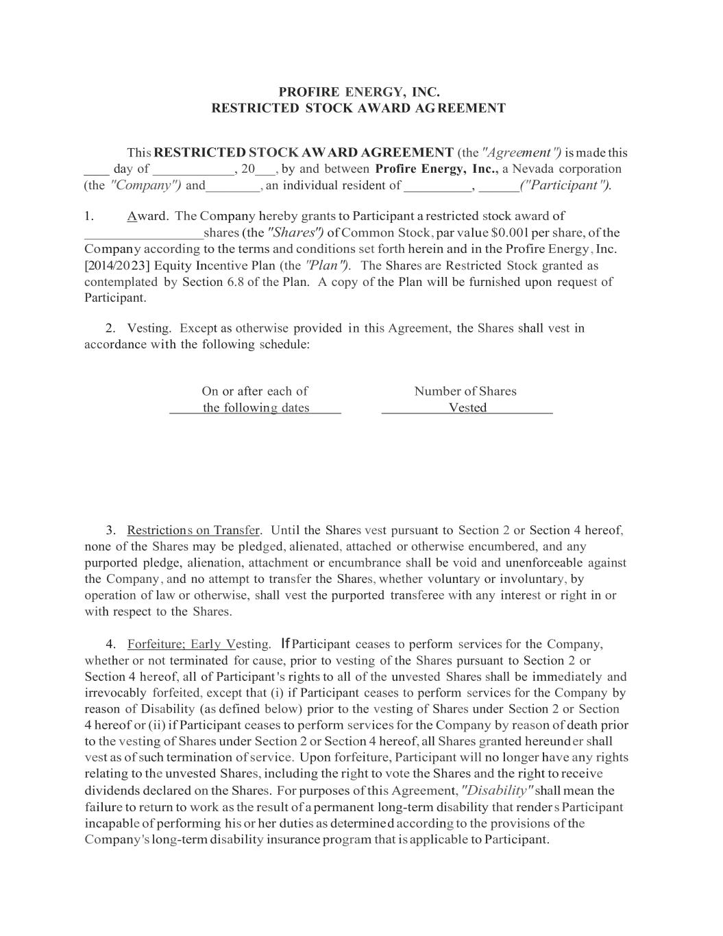 PROFIRE ENERGY, INC. RESTRICTED STOCK AWARD AG REEMENT This RESTRICTED STOCK AWARD AGREEMENT (the "Agreement") is made this ____ day of ____________, 20___, by and between Profire Energy, Inc., a Nevada corporation (the "Company") and________, an individual resident of __________, ______("Participant "). 1. Award. The Company hereby grants to Participant a restricted stock award of _________________shares (the "Shares") of Common Stock, par value $0.00 l per share, of the Company according to the terms and conditions set forth herein and in the Profire Energy , Inc. [2014/20 23] Equity Incentive Plan (the "Plan"). The Shares are Restricted Stock granted as contemplated by Section 6.8 of the Plan. A copy of the Plan will be furnished upon request of Participant. 2. Vesting. Except as otherwise provided in this Agreement, the Shares shall vest in accordance with the following schedule: On or after each of the followin g dates Number of Shares Vested 3. Restriction s on Transfer. Until the Shares vest pursuant to Section 2 or Section 4 hereof, none of the Shares may be pledged, alienated, attached or otherwise encumbered, and any purported pledge, alienation, attachment or encumbrance shall be void and unenforceable against the Company, and no attempt to transfer the Shares, whether voluntary or involuntary, by operation of law or otherwise, shall vest the purported transferee with any interest or right in or with respect to the Shares. 4. Forfeiture; Earl y Vesting. If Participant ceases to perform services for the Company, whether or not terminated for cause, prior to vesting of the Shares pursuant to Section 2 or Section 4 hereof, all of Participant 's rights to all of the unvested Shares shall be immediately and irrevocably forfeited, except that (i) if Participant ceases to perform services for the Company by reason of Disability (as defined below) prior to the vesting of Shares under Section 2 or Section 4 hereof or (ii) if Participant ceases to perform services for the Company by reason of death prior to the vesting of Shares under Section 2 or Section 4 hereof, all Shares granted hereunder shall vest as of such termination of service. Upon forfeiture, Participant will no longer have any rights relating to the unvested Shares, including the right to vote the Shares and the right to receive dividends declared on the Shares. For purposes of this Agreement, "Disability" shall mean the failure to return to work as the result of a permanent long-term disability that render s Participant incapable of performing his or her duties as determine d according to the provisions of the Company 's long-term disability insurance program that is applicable to Participant.