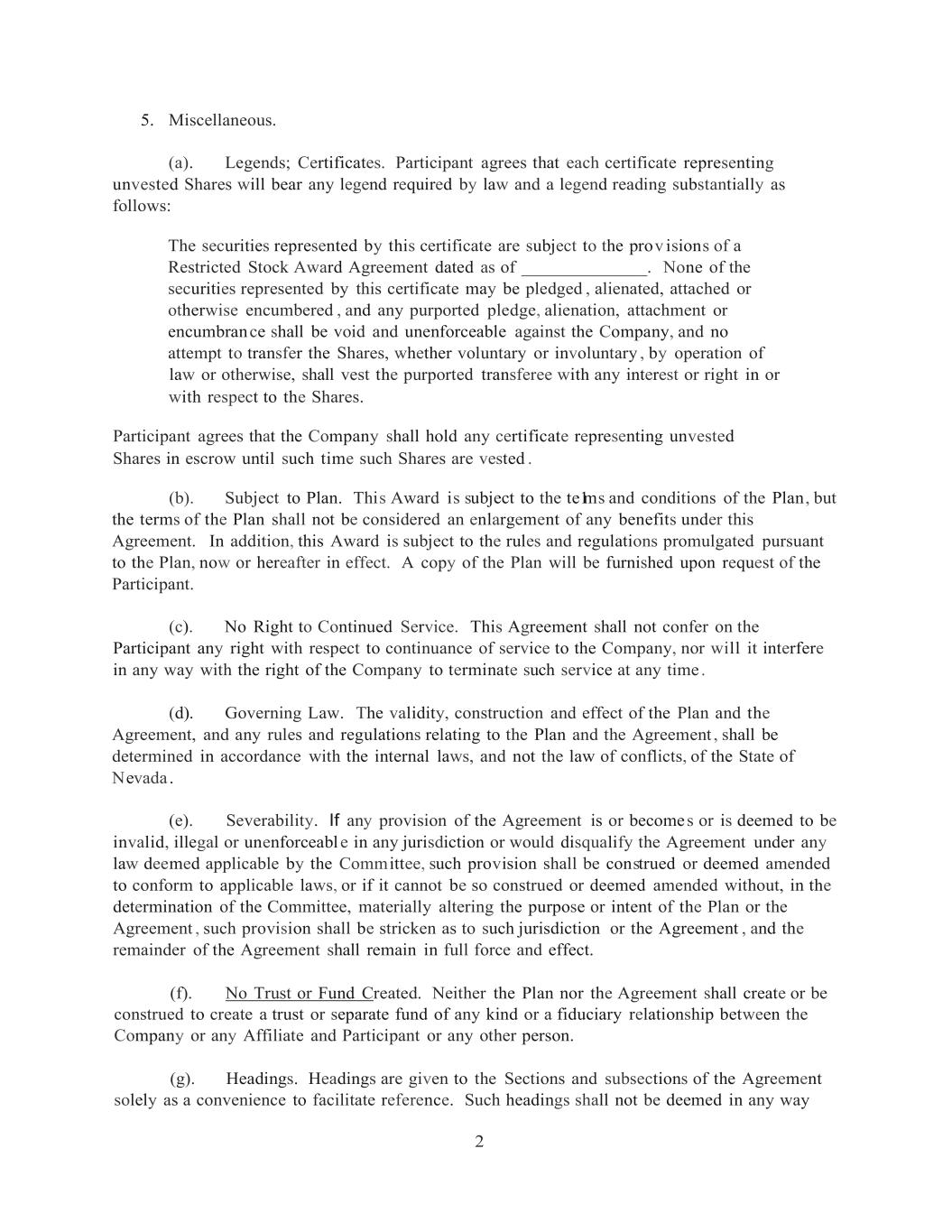 2 5. Miscellaneous. (a). Legends; Certificates. Participant agrees that each certificate representing unvested Shares will bear any legend required by law and a legend reading substantially as follows: The securities represented by this certificate are subject to the prov isions of a Restricted Stock Award Agreement dated as of ______________. None of the securities represented by this certificate may be pledged , alienated, attached or otherwise encumbered , and any purported pledge, alienation, attachment or encumbrance shall be void and unenforceable against the Company, and no attempt to transfer the Shares, whether voluntary or involuntary , by operation of law or otherwise, shall vest the purported transferee with any interest or right in or with respect to the Shares. Participant agrees that the Company shall hold any certificate representing unvested Shares in escrow until such time such Shares are vested . (b). Subject to Plan. This Award is subject to the te1ms and conditions of the Plan, but the terms of the Plan shall not be considered an enlargement of any benefits under this Agreement. In addition, this Award is subject to the rules and regulations promulgated pursuant to the Plan, now or hereafter in effect. A copy of the Plan will be furnished upon request of the Participant. (c). No Right to Continued Service. This Agreement shall not confer on the Participant any right with respect to continuance of service to the Company, nor will it interfere in any way with the right of the Company to terminate such service at any time . (d). Governing Law. The validity, construction and effect of the Plan and the Agreement, and any rules and regulations relating to the Plan and the Agreement , shall be determined in accordance with the internal laws, and not the law of conflicts, of the State of Nevada . (e). Severability. If any provision of the Agreement is or becomes or is deemed to be invalid, illegal or unenforceabl e in any jurisdiction or would disqualify the Agreement under any law deemed applicable by the Committee, such provision shall be construed or deemed amended to conform to applicable laws, or if it cannot be so construed or deemed amended without, in the determination of the Committee, materially altering the purpose or intent of the Plan or the Agreement , such provision shall be stricken as to such jurisdiction or the Agreement , and the remainder of the Agreement shall remain in full force and effect. (f). No Trust or Fund Created. Neither the Plan nor the Agreement shall create or be construed to create a trust or separate fund of any kind or a fiduciary relationship between the Company or any Affiliate and Participant or any other person. (g). Headings. Headings are given to the Sections and subsections of the Agreement solely as a convenience to facilitate reference. Such headings shall not be deemed in any way