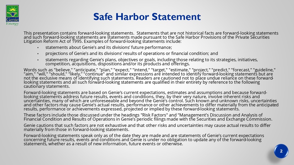 "believe," "anticipate," "plan," "expect," "intend," "target," "estimate," "project," "predict," "forecast," "guideline," "aim," "will," "should," “likely,” "continue" and similar expressions are intended to identify forward - looking statements but are not the exclusive means of identifying such statements. Readers are cautioned not to place undue reliance on these forward - looking statements and all such forward - looking statements are qualified in their entirety by reference to the following cautionary statements. Forward - looking statements are based on Genie’s current expectations, estimates and assumptions and because forward - looking statements address future results, events and conditions, they, by their very nature, involve inherent risks and uncertainties, many of which are unforeseeable and beyond the Genie’s control. Such known and unknown risks, uncertainties and other factors may cause Genie’s actual results, performance or other achievements to differ materially from the anticipated results, performance or achievements expressed, projected or implied by these forward - looking statements. These factors include those discussed under the headings "Risk Factors" and “Management’s Discussion and Analysis of Financial Condition and Results of Operations in Genie’s periodic filings made with the Securities and Exchange Commission. Genie cautions that such factors are not exhaustive and that other risks and uncertainties may cause actual results to differ materially from those in forward - looking statements. Forward - looking statements speak only as of the date they are made and are statements of Genie’s current expectations concerning future results, events and conditions and Genie is under no obligation to update any of the forward - looking statements, whether as a result of new information, future events or otherwise.