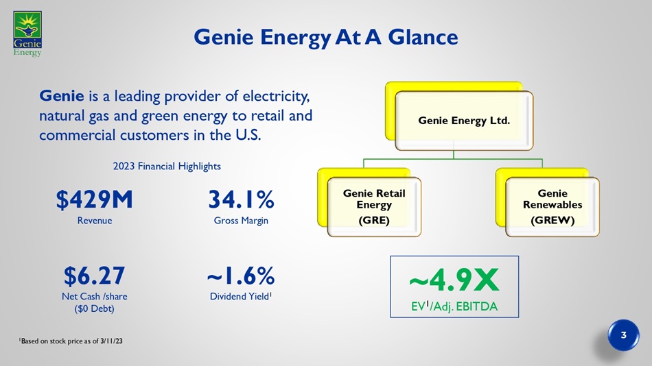 Genie Energy At A Glance 1 Based on stock price as of 3/11/23 $429M Revenue 34.1% Gross Margin ~1.6% Dividend Yield 1 Genie Energy Ltd. Genie Retail Energy (GRE) Genie Renewables (GREW) ~4.9X EV 1 /Adj. EBITDA 3 $6.27 Net Cash /share ($0 Debt) Genie is a leading provider of electricity, natural gas and green energy to retail and commercial customers in the U . S . 2023 Financial Highlights