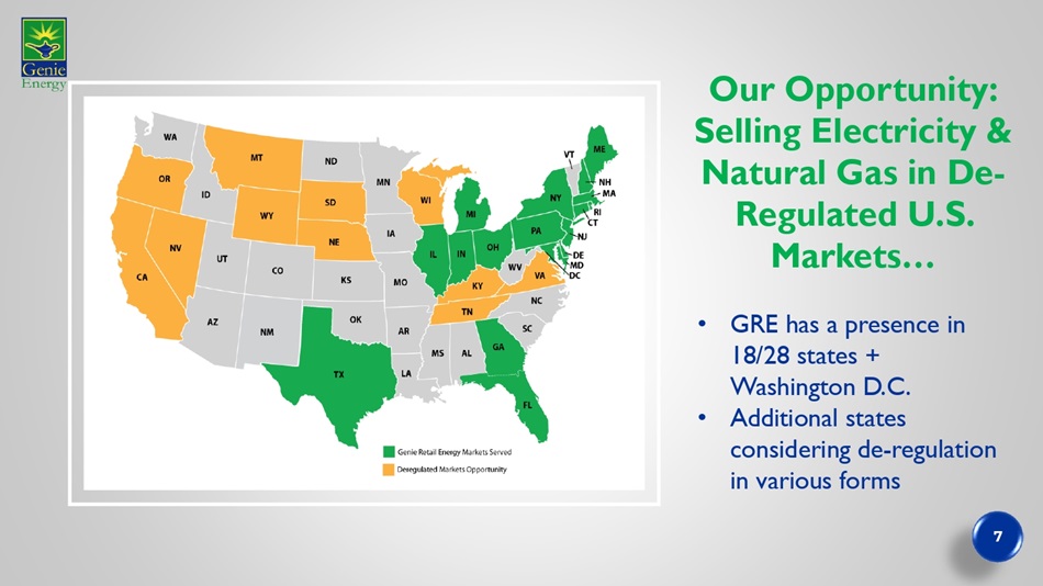 Our Opportunity: Selling Electricity & Natural Gas in De - Regulated U.S. Markets… • GRE has a presence in 18/28 states + Washington D.C. • Additional states considering de - regulation in various forms 7