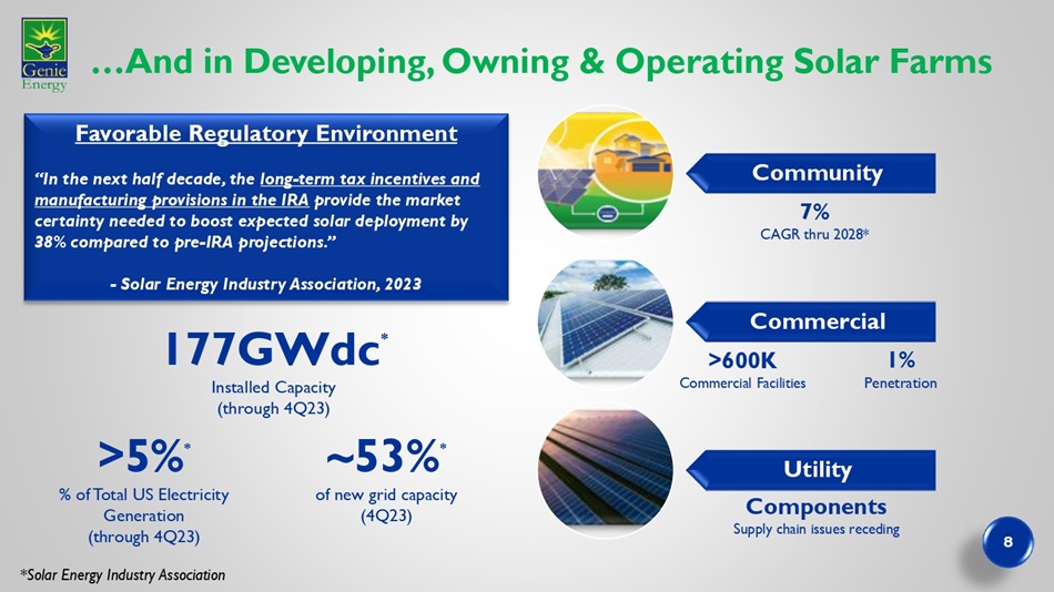…And in Developing, Owning & Operating Solar Farms *Solar Energy Industry Association Commercial >600K Commercial Facilities 1% Penetration Utility Components Supply chain issues receding Community 7% CAGR thru 2028* Favorable Regulatory Environment “In the next half decade, the long - term tax incentives and manufacturing provisions in the IRA provide the market certainty needed to boost expected solar deployment by 38% compared to pre - IRA projections.” - Solar Energy Industry Association, 2023 >5% * % of Total US Electricity Generation (through 4Q23) ~53% * of new grid capacity (4Q23) 177GWdc * Installed Capacity (through 4Q23) 8