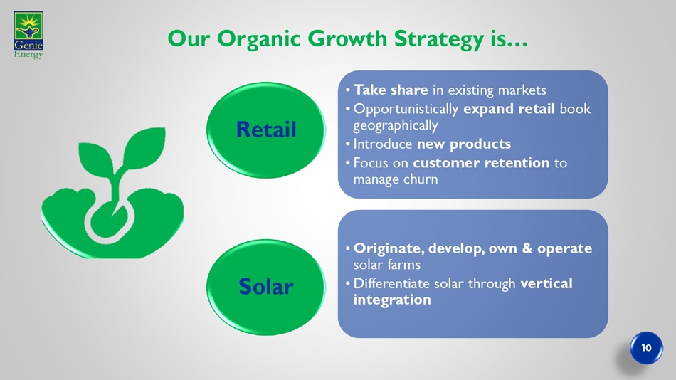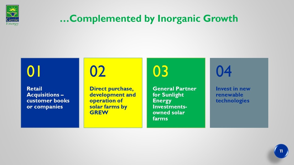 Our Organic Growth Strategy is… Retail Solar • Take share in existing markets • Opportunistically expand retail book geographically • Introduce new products • Focus on customer retention to manage churn • Originate, develop, own & operate solar farms • Differentiate solar through vertical integration 10