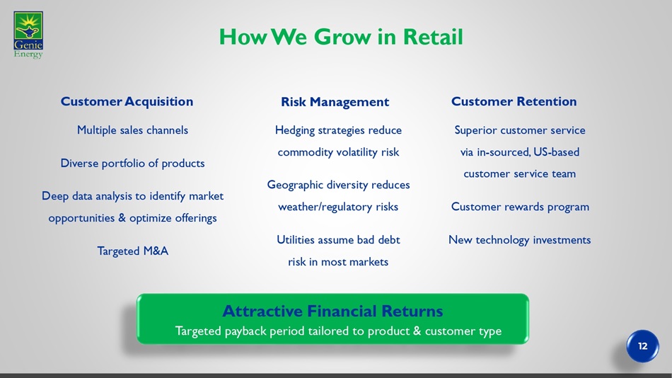 Attractive Financial Returns Targeted payback period tailored to product & customer type How We Grow in Retail Multiple sales channels Diverse portfolio of products Deep data analysis to identify market opportunities & optimize offerings Targeted M&A Hedging strategies reduce commodity volatility risk Geographic diversity reduces weather/regulatory risks Utilities assume bad debt risk in most markets Superior customer service via in - sourced, US - based customer service team Customer rewards program New technology investments Customer Acquisition Risk Management Customer Retention 12