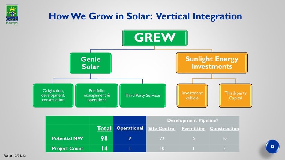 How We Grow in Solar: Vertical Integration GREW Genie Solar Origination, development, construction Portfolio management & operations Third Party Services Sunlight Energy Investments Investment vehicle Third - party Capital 13 Development Pipeline* Operational Total Construction Permitting Site Control 10 6 72 9 98 Potential MW 2 1 10 1 14 Project Count *as of 12/31/23