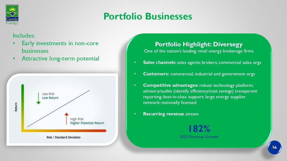 Portfolio Businesses Includes: • Early investments in non - core businesses • Attractive long - term potential Portfolio Highlight: Diversegy One of the nation’s leading retail energy brokerage firms • Sales channels: sales agents; brokers; commercial sales orgs • Customers: commercial, industrial and government orgs • Competitive advantages: robust technology platform; advisory/audits (identify efficiency/cost savings) transparent reporting; best - in - class support; large energy supplier network; nationally licensed • Recurring revenue stream 182% 2023 Revenue Growth 14