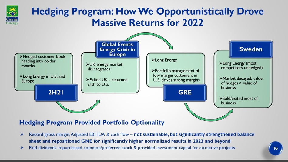 » Hedged customer book heading into colder months » Long Energy in U.S. and Europe 2H21 » Exited UK - returned cash to U.S. Global Events: Energy Crisis in Europe » UK energy market disintegrates » Long Energy » Portfolio management of low margin customers in U.S. drives strong margins GRE » Long Energy (most competitors unhedged) » Market decayed, value of hedges > value of business » Sold/exited most of business Sweden Hedging Program Provided Portfolio Optionality » Record gross margin, Adjusted EBITDA & cash flow – not sustainable, but significantly strengthened balance sheet and repositioned GNE for significantly higher normalized results in 2023 and beyond » Paid dividends, repurchased common/preferred stock & provided investment capital for attractive projects 16 Hedging Program: How We Opportunistically Drove Massive Returns for 2022