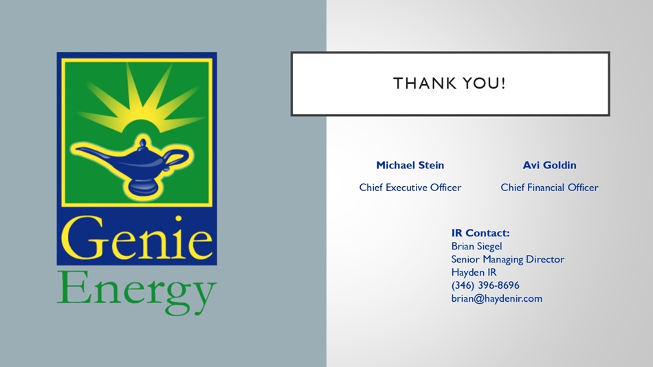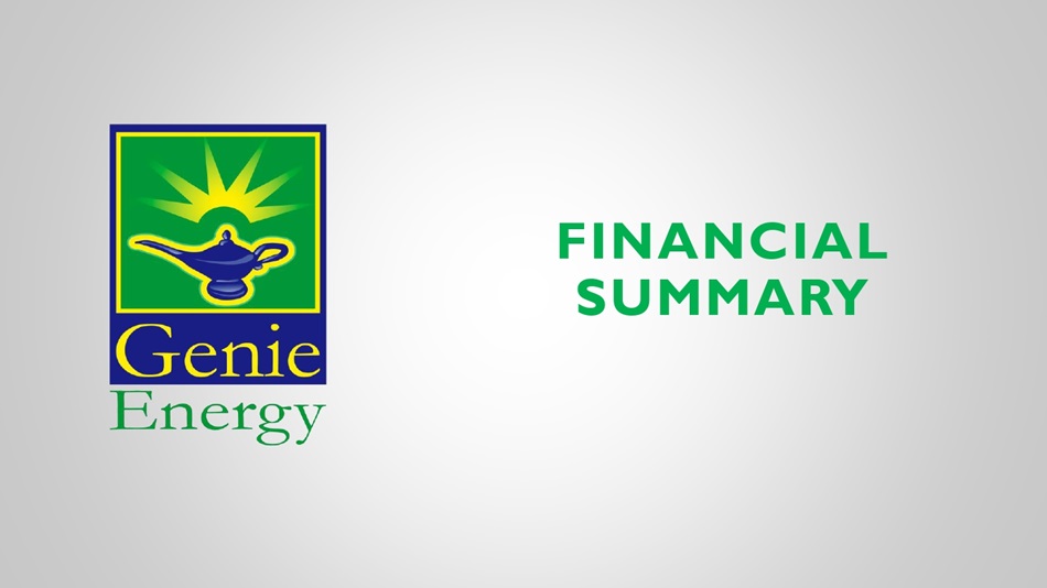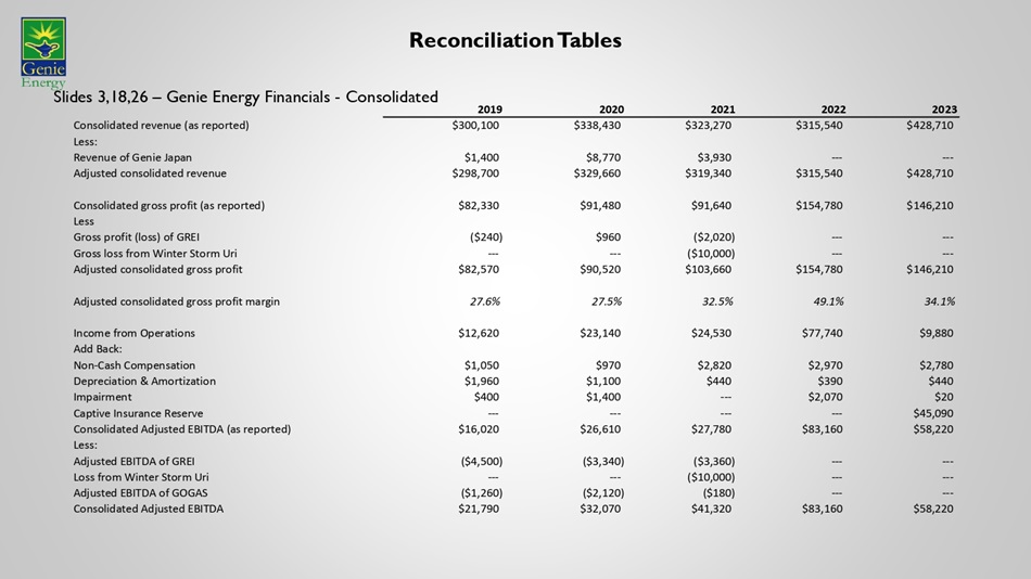Reconciliation Tables Slides 3,18,26 – Genie Energy Financials - Consolidated 2023 2022 2021 2020 2019 $428,710 $315,540 $323,270 $338,430 $300,100 Consolidated revenue (as reported) -- - -- - $3,930 $8,770 $1,400 Less: Revenue of Genie Japan $428,710 $315,540 $319,340 $329,660 $298,700 Adjusted consolidated revenue $146,210 $154,780 $91,640 $91,480 $82,330 Consolidated gross profit (as reported) -- - -- - ($2,020) $960 ($240) Less Gross profit (loss) of GREI -- - -- - ($10,000) -- - -- - Gross loss from Winter Storm Uri $146,210 $154,780 $103,660 $90,520 $82,570 Adjusted consolidated gross profit 34.1% 49.1% 32.5% 27.5% 27.6% Adjusted consolidated gross profit margin $9,880 $77,740 $24,530 $23,140 $12,620 Income from Operations $2,780 $2,970 $2,820 $970 $1,050 Add Back: Non - Cash Compensation $440 $390 $440 $1,100 $1,960 Depreciation & Amortization $20 $2,070 -- - $1,400 $400 Impairment $45,090 -- - -- - -- - -- - Captive Insurance Reserve $58,220 $83,160 $27,780 $26,610 $16,020 Consolidated Adjusted EBITDA (as reported) -- - -- - ($3,360) ($3,340) ($4,500) Less: Adjusted EBITDA of GREI -- - -- - ($10,000) -- - -- - Loss from Winter Storm Uri -- - -- - ($180) ($2,120) ($1,260) Adjusted EBITDA of GOGAS $58,220 $83,160 $41,320 $32,070 $21,790 Consolidated Adjusted EBITDA