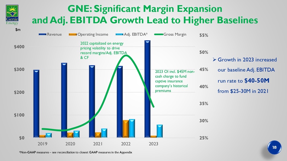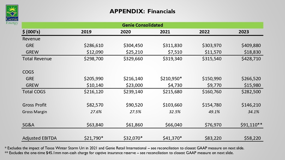 APPENDIX: Financials * Excludes the impact of Texas Winter Storm Uri in 2021 and Genie Retail International – see reconciliation to closest GAAP measure on next slide. ** Excludes the one - time $45.1mm non - cash charge for captive insurance reserve – see reconciliation to closest GAAP measure on next slide. Genie Consolidated 2023 2022 2021 2020 2019 $ (000's) $409,880 $303,970 $311,830 $304,450 $286,610 Revenue GRE $18,830 $11,570 $7,510 $25,210 $12,090 GREW $428,710 $315,540 $319,340 $329,660 $298,700 Total Revenue $266,520 $150,990 $210,950* $216,140 $205,990 COGS GRE $15,980 $9,770 $4,730 $23,000 $10,140 GREW $282,500 $160,760 $215,680 $239,140 $216,120 Total COGS $146,210 $154,780 $103,660 $90,520 $82,570 Gross Profit 34.1% 49.1% 32.5% 27.5% 27.6% Gross Margin $91,110** $76,970 $66,040 $61,860 $63,840 SG&A $58,220 $83,220 $41,370* $32,070* $21,790* Adjusted EBITDA