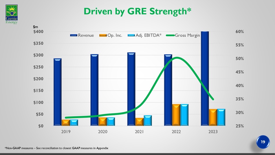 GNE: Significant Margin Expansion and Adj. EBITDA Growth Lead to Higher Baselines 25% 30% 35% 40% 45% 50% 55% $0 $100 $200 $300 $400 2023 Gross Margin $m 2019 2020 2021 2022 *Non - GAAP measures – see reconciliation to closest GAAP measures in the Appendix 18 » Growth in 2023 increased our baseline Adj. EBITDA run rate to $40 - 50M from $25 - 30M in 2021 2023 OI incl. $45M non - cash charge to fund captive insurance company’s historical premiums Revenue Operating Income Adj. EBITDA* 2022 capitalized on energy pricing volatility to drive record margins/Adj. EBITDA & CF