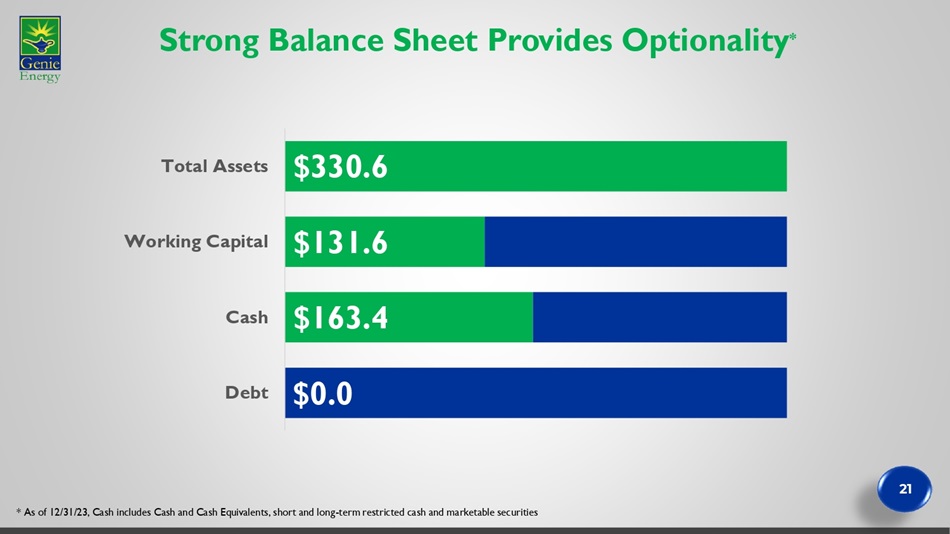 Strong Balance Sheet Provides Optionality * * As of 12/31/23, Cash includes Cash and Cash Equivalents, short and long - term restricted cash and marketable securities $0.0 $163.4 $131.6 $330.6 Debt Cash Working Capital Total Assets 21