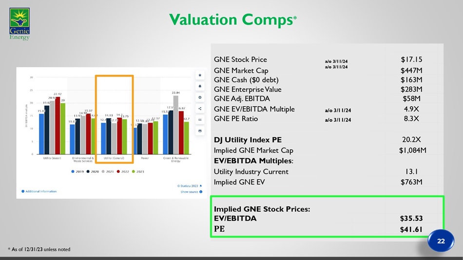 Valuation Comps * * As of 12/31/23 unless noted $17.15 a/o 3/11/24 GNE Stock Price $447M a/o 3/11/24 GNE Market Cap $163M GNE Cash ($0 debt) $283M GNE Enterprise Value $58M GNE Adj. EBITDA 4.9X a/o 3/11/24 GNE EV/EBITDA Multiple 8.3X a/o 3/11/24 GNE PE Ratio 20.2X DJ Utility Index PE $1,084M Implied GNE Market Cap EV/EBITDA Multiples : 13.1 Utility Industry Current $763M Implied GNE EV Implied GNE Stock Prices: $35.53 EV/EBITDA $41.61 PE 22