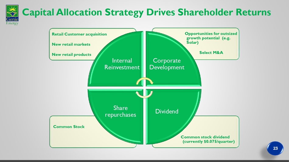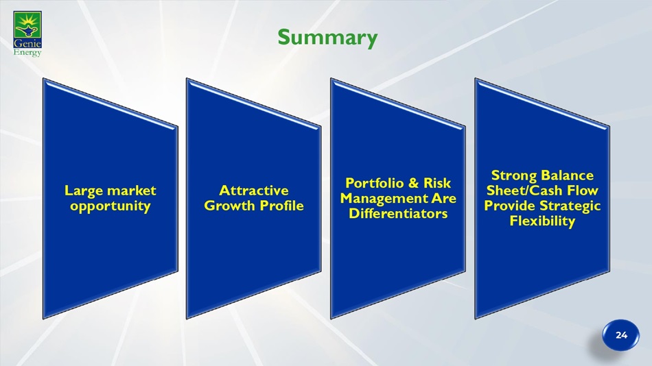 Capital Allocation Strategy Drives Shareholder Returns Common stock dividend (currently $0.075/quarter) Common Stock Opportunities for outsized growth potential (e.g. Solar) Select M&A Retail Customer acquisition New retail markets New retail products Internal Reinvestment Corporate Development Dividend Share repurchases 23