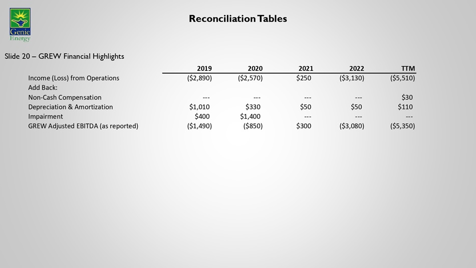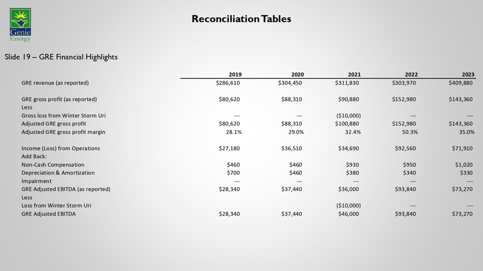 Reconciliation Tables Slide 19 – GRE Financial Highlights 2023 2022 2021 2020 2019 $409,880 $303,970 $311,830 $304,450 $286,610 GRE revenue (as reported) $143,360 $152,980 $90,880 $88,310 $80,620 GRE gross profit (as reported) -- - -- - ($10,000) -- - -- - Less Gross loss from Winter Storm Uri $143,360 $152,980 $100,880 $88,310 $80,620 Adjusted GRE gross profit 35.0% 50.3% 32.4% 29.0% 28.1% Adjusted GRE gross profit margin $71,910 $92,560 $34,690 $36,510 $27,180 Income (Loss) from Operations $1,020 $950 $930 $460 $460 Add Back: Non - Cash Compensation $330 $340 $380 $460 $700 Depreciation & Amortization -- - -- - -- - -- - -- - Impairment $73,270 -- - $93,840 -- - $36,000 ($10,000) $37,440 $28,340 GRE Adjusted EBITDA (as reported) Less Loss from Winter Storm Uri $73,270 $93,840 $46,000 $37,440 $28,340 GRE Adjusted EBITDA