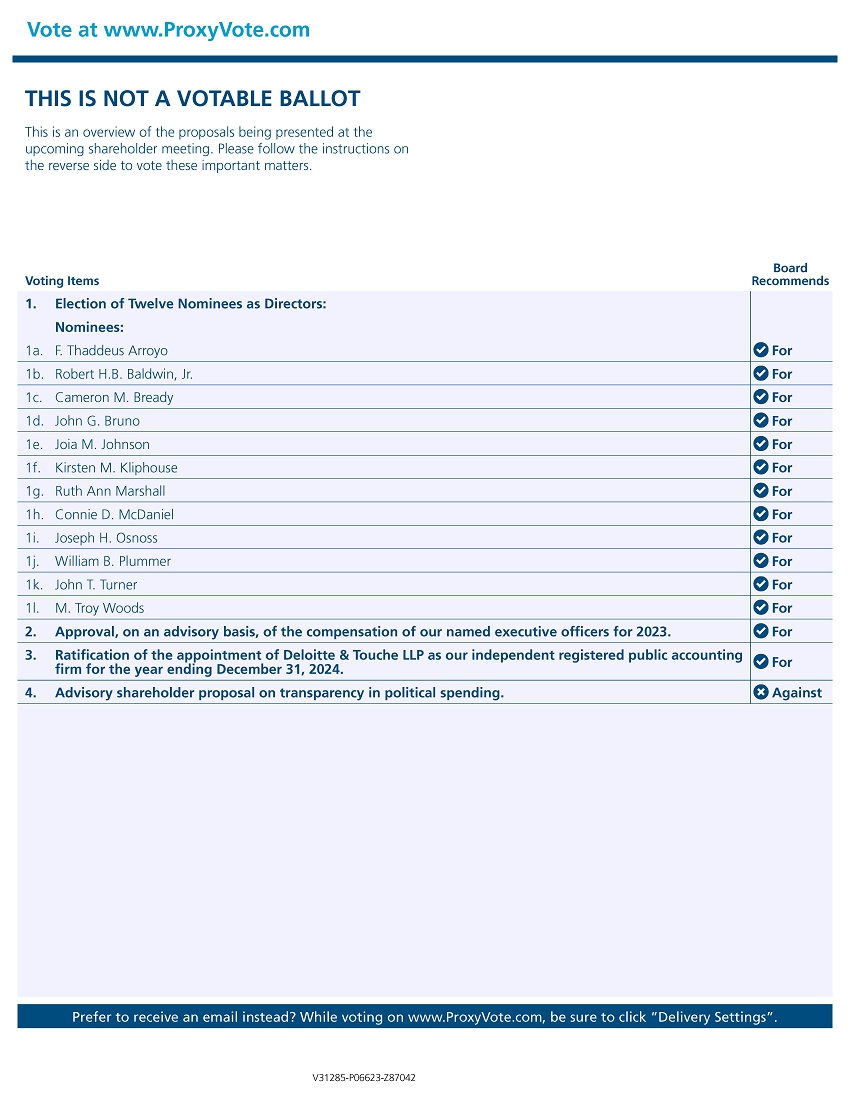 Vote at www.ProxyVote.comTHIS IS NOT A VOTABLE BALLOT This is an overview of the proposals being presented at the upcoming shareholder meeting. Please follow the instructions on the reverse side to vote these important matters.Voting Items 1. Election of Twelve Nominees as Directors: Nominees:Board Recommends1a. F. Thaddeus Arroyo 1b. Robert H.B. Baldwin, Jr. 1c. Cameron M. Bready 1d. John G. Bruno 1e. Joia M. Johnson 1f. Kirsten M. Kliphouse 1g. Ruth Ann Marshall 1h. Connie D. McDaniel 1i. Joseph H. Osnoss 1j. William B. Plummer 1k. John T. Turner 1l. M. Troy Woods 2. Approval, on an advisory basis, of the compensation of our named executive officers for 2023. 3. Ratification of the appointment of Deloitte & Touche LLP as our independent registered public accounting firm for the year ending December 31, 2024. 4. Advisory shareholder proposal on transparency in political spending.For For For For For For For For For For For For For For AgainstPrefer to receive an email instead? While voting on www.ProxyVote.com, be sure to click “Delivery Settings”.V31285-P06623-Z87042