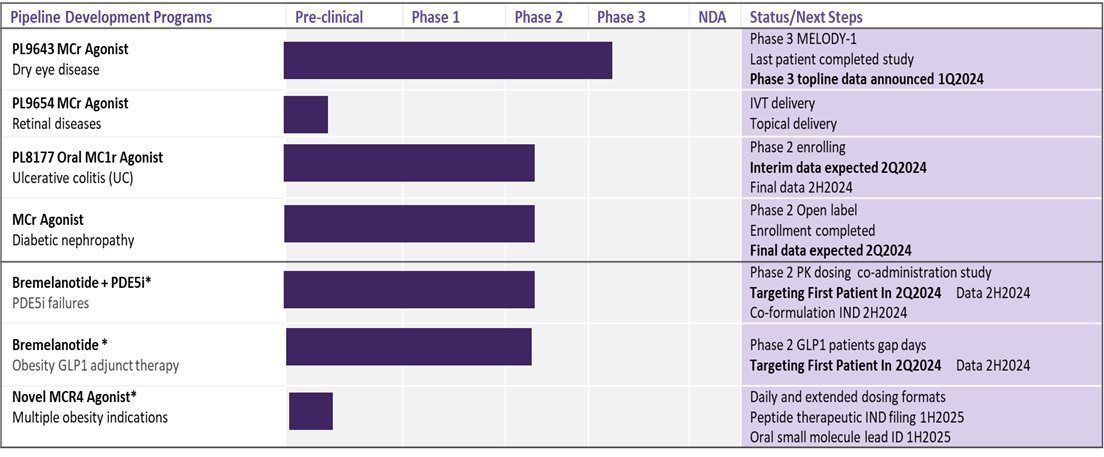 | o | PL9643, an ophthalmic peptide solution for dry eye disease (“DED”), which entered Phase 3 clinical trials in the fourth quarter of calendar year 2021, with top line results from the first Phase 3 clinical trial announced February 28, 2024, in which PL9643 did not achieve statistical significance for any clinical sign efficacy endpoint, and met positive results for the clinical symptom endpoint of pain, but only with age and sex adjustment in the statistical analysis; |