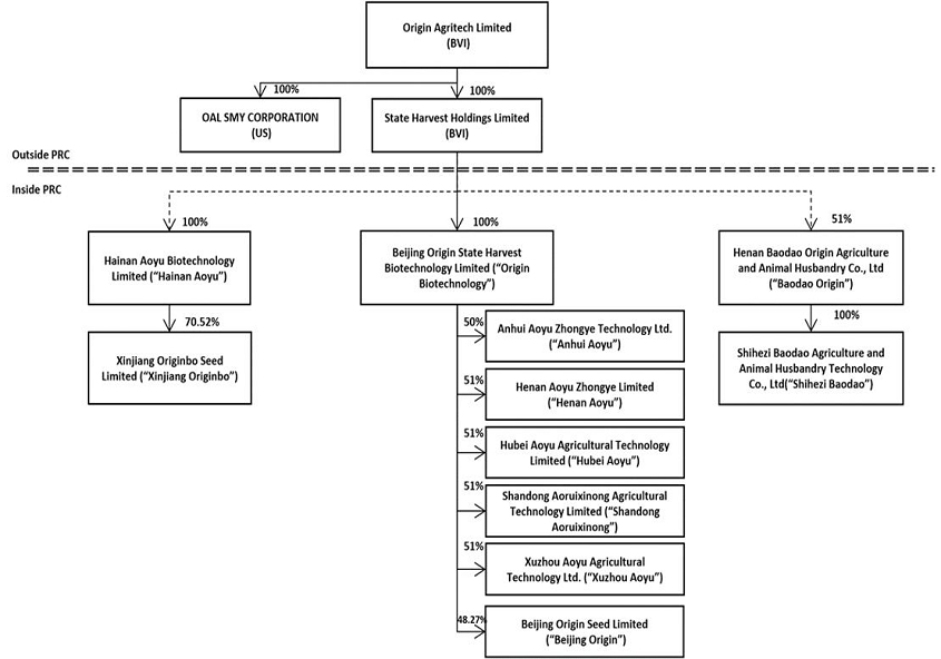 The public company, Origin Agritech Limited, referred to as Origin Agritech, in which investors hold shares, is a holding company incorporated in the British Virgin Islands. All of our business activities currently take place in China. Part of our operations are conducted in China through variable interest enterprises, or VIEs. The portion of the business that is a VIE is Hainan Aoyu and its subsidiary Xinjiang Origin, and Baodao Origin and its subsidiary Shihezi Baodao. The balance of our operations are conducted through wholly and partly equity owned operations, in or under Origin Biotechnology, which in turn is 100% equity owned by State Harvest Holdings Limited (“State Harvest”).