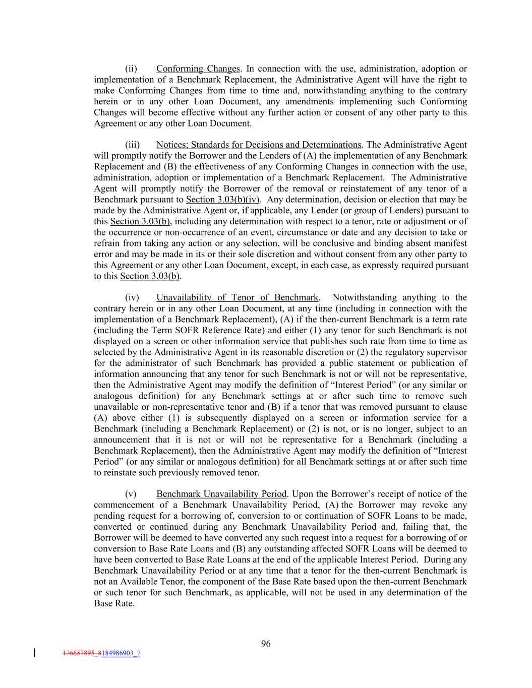 (ii) Conforming Changes. In connection with the use, administration, adoption or implementation of a Benchmark Replacement, the Administrative Agent will have the right to make Conforming Changes from time to time and, notwithstanding anything to the contrary herein or in any other Loan Document, any amendments implementing such Conforming Changes will become effective without any further action or consent of any other party to this Agreement or any other Loan Document. (iii) Notices; Standards for Decisions and Determinations. The Administrative Agent will promptly notify the Borrower and the Lenders of (A) the implementation of any Benchmark Replacement and (B) the effectiveness of any Conforming Changes in connection with the use, administration, adoption or implementation of a Benchmark Replacement. The Administrative Agent will promptly notify the Borrower of the removal or reinstatement of any tenor of a Benchmark pursuant to Section 3.03(b)(iv). Any determination, decision or election that may be made by the Administrative Agent or, if applicable, any Lender (or group of Lenders) pursuant to this Section 3.03(b), including any determination with respect to a tenor, rate or adjustment or of the occurrence or non-occurrence of an event, circumstance or date and any decision to take or refrain from taking any action or any selection, will be conclusive and binding absent manifest error and may be made in its or their sole discretion and without consent from any other party to this Agreement or any other Loan Document, except, in each case, as expressly required pursuant to this Section 3.03(b). (iv) Unavailability of Tenor of Benchmark. Notwithstanding anything to the contrary herein or in any other Loan Document, at any time (including in connection with the implementation of a Benchmark Replacement), (A) if the then-current Benchmark is a term rate (including the Term SOFR Reference Rate) and either (1) any tenor for such Benchmark is not displayed on a screen or other information service that publishes such rate from time to time as selected by the Administrative Agent in its reasonable discretion or (2) the regulatory supervisor for the administrator of such Benchmark has provided a public statement or publication of information announcing that any tenor for such Benchmark is not or will not be representative, then the Administrative Agent may modify the definition of “Interest Period” (or any similar or analogous definition) for any Benchmark settings at or after such time to remove such unavailable or non-representative tenor and (B) if a tenor that was removed pursuant to clause (A) above either (1) is subsequently displayed on a screen or information service for a Benchmark (including a Benchmark Replacement) or (2) is not, or is no longer, subject to an announcement that it is not or will not be representative for a Benchmark (including a Benchmark Replacement), then the Administrative Agent may modify the definition of “Interest Period” (or any similar or analogous definition) for all Benchmark settings at or after such time to reinstate such previously removed tenor. (v) Benchmark Unavailability Period. Upon the Borrower’s receipt of notice of the commencement of a Benchmark Unavailability Period, (A) the Borrower may revoke any pending request for a borrowing of, conversion to or continuation of SOFR Loans to be made, converted or continued during any Benchmark Unavailability Period and, failing that, the Borrower will be deemed to have converted any such request into a request for a borrowing of or conversion to Base Rate Loans and (B) any outstanding affected SOFR Loans will be deemed to have been converted to Base Rate Loans at the end of the applicable Interest Period. During any Benchmark Unavailability Period or at any time that a tenor for the then-current Benchmark is not an Available Tenor, the component of the Base Rate based upon the then-current Benchmark or such tenor for such Benchmark, as applicable, will not be used in any determination of the Base Rate. 96 176657895_8184986903_7