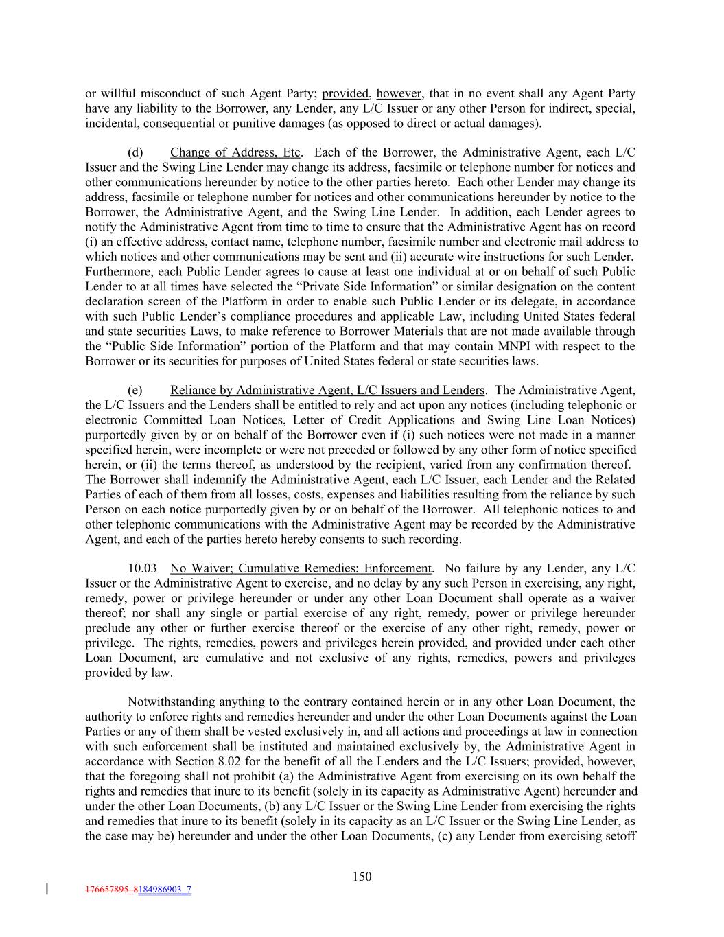or willful misconduct of such Agent Party; provided, however, that in no event shall any Agent Party have any liability to the Borrower, any Lender, any L/C Issuer or any other Person for indirect, special, incidental, consequential or punitive damages (as opposed to direct or actual damages). (d) Change of Address, Etc. Each of the Borrower, the Administrative Agent, each L/C Issuer and the Swing Line Lender may change its address, facsimile or telephone number for notices and other communications hereunder by notice to the other parties hereto. Each other Lender may change its address, facsimile or telephone number for notices and other communications hereunder by notice to the Borrower, the Administrative Agent, and the Swing Line Lender. In addition, each Lender agrees to notify the Administrative Agent from time to time to ensure that the Administrative Agent has on record (i) an effective address, contact name, telephone number, facsimile number and electronic mail address to which notices and other communications may be sent and (ii) accurate wire instructions for such Lender. Furthermore, each Public Lender agrees to cause at least one individual at or on behalf of such Public Lender to at all times have selected the “Private Side Information” or similar designation on the content declaration screen of the Platform in order to enable such Public Lender or its delegate, in accordance with such Public Lender’s compliance procedures and applicable Law, including United States federal and state securities Laws, to make reference to Borrower Materials that are not made available through the “Public Side Information” portion of the Platform and that may contain MNPI with respect to the Borrower or its securities for purposes of United States federal or state securities laws. (e) Reliance by Administrative Agent, L/C Issuers and Lenders. The Administrative Agent, the L/C Issuers and the Lenders shall be entitled to rely and act upon any notices (including telephonic or electronic Committed Loan Notices, Letter of Credit Applications and Swing Line Loan Notices) purportedly given by or on behalf of the Borrower even if (i) such notices were not made in a manner specified herein, were incomplete or were not preceded or followed by any other form of notice specified herein, or (ii) the terms thereof, as understood by the recipient, varied from any confirmation thereof. The Borrower shall indemnify the Administrative Agent, each L/C Issuer, each Lender and the Related Parties of each of them from all losses, costs, expenses and liabilities resulting from the reliance by such Person on each notice purportedly given by or on behalf of the Borrower. All telephonic notices to and other telephonic communications with the Administrative Agent may be recorded by the Administrative Agent, and each of the parties hereto hereby consents to such recording. 10.03 No Waiver; Cumulative Remedies; Enforcement. No failure by any Lender, any L/C Issuer or the Administrative Agent to exercise, and no delay by any such Person in exercising, any right, remedy, power or privilege hereunder or under any other Loan Document shall operate as a waiver thereof; nor shall any single or partial exercise of any right, remedy, power or privilege hereunder preclude any other or further exercise thereof or the exercise of any other right, remedy, power or privilege. The rights, remedies, powers and privileges herein provided, and provided under each other Loan Document, are cumulative and not exclusive of any rights, remedies, powers and privileges provided by law. Notwithstanding anything to the contrary contained herein or in any other Loan Document, the authority to enforce rights and remedies hereunder and under the other Loan Documents against the Loan Parties or any of them shall be vested exclusively in, and all actions and proceedings at law in connection with such enforcement shall be instituted and maintained exclusively by, the Administrative Agent in accordance with Section 8.02 for the benefit of all the Lenders and the L/C Issuers; provided, however, that the foregoing shall not prohibit (a) the Administrative Agent from exercising on its own behalf the rights and remedies that inure to its benefit (solely in its capacity as Administrative Agent) hereunder and under the other Loan Documents, (b) any L/C Issuer or the Swing Line Lender from exercising the rights and remedies that inure to its benefit (solely in its capacity as an L/C Issuer or the Swing Line Lender, as the case may be) hereunder and under the other Loan Documents, (c) any Lender from exercising setoff 150 176657895_8184986903_7