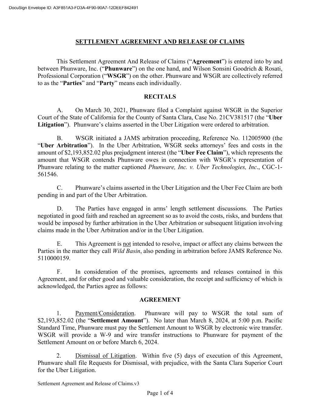 Settlement Agreement and Release of Claims.v3 Page 1 of 4 SETTLEMENT AGREEMENT AND RELEASE OF CLAIMS This Settlement Agreement And Release of Claims (“Agreement”) is entered into by and between Phunware, Inc. (“Phunware”) on the one hand, and Wilson Sonsini Goodrich & Rosati, Professional Corporation (“WSGR”) on the other. Phunware and WSGR are collectively referred to as the “Parties” and “Party” means each individually. RECITALS A. On March 30, 2021, Phunware filed a Complaint against WSGR in the Superior Court of the State of California for the County of Santa Clara, Case No. 21CV381517 (the “Uber Litigation”). Phunware’s claims asserted in the Uber Litigation were ordered to arbitration. B. WSGR initiated a JAMS arbitration proceeding, Reference No. 112005900 (the “Uber Arbitration”). In the Uber Arbitration, WSGR seeks attorneys’ fees and costs in the amount of $2,193,852.02 plus prejudgment interest (the “Uber Fee Claim”), which represents the amount that WSGR contends Phunware owes in connection with WSGR’s representation of Phunware relating to the matter captioned Phunware, Inc. v. Uber Technologies, Inc., CGC-1- 561546. C. Phunware’s claims asserted in the Uber Litigation and the Uber Fee Claim are both pending in and part of the Uber Arbitration. D. The Parties have engaged in arms’ length settlement discussions. The Parties negotiated in good faith and reached an agreement so as to avoid the costs, risks, and burdens that would be imposed by further arbitration in the Uber Arbitration or subsequent litigation involving claims made in the Uber Arbitration and/or in the Uber Litigation. E. This Agreement is not intended to resolve, impact or affect any claims between the Parties in the matter they call Wild Basin, also pending in arbitration before JAMS Reference No. 5110000159. F. In consideration of the promises, agreements and releases contained in this Agreement, and for other good and valuable consideration, the receipt and sufficiency of which is acknowledged, the Parties agree as follows: AGREEMENT 1. Payment/Consideration. Phunware will pay to WSGR the total sum of $2,193,852.02 (the “Settlement Amount”). No later than March 8, 2024, at 5:00 p.m. Pacific Standard Time, Phunware must pay the Settlement Amount to WSGR by electronic wire transfer. WSGR will provide a W-9 and wire transfer instructions to Phunware for payment of the Settlement Amount on or before March 6, 2024. 2. Dismissal of Litigation. Within five (5) days of execution of this Agreement, Phunware shall file Requests for Dismissal, with prejudice, with the Santa Clara Superior Court for the Uber Litigation.