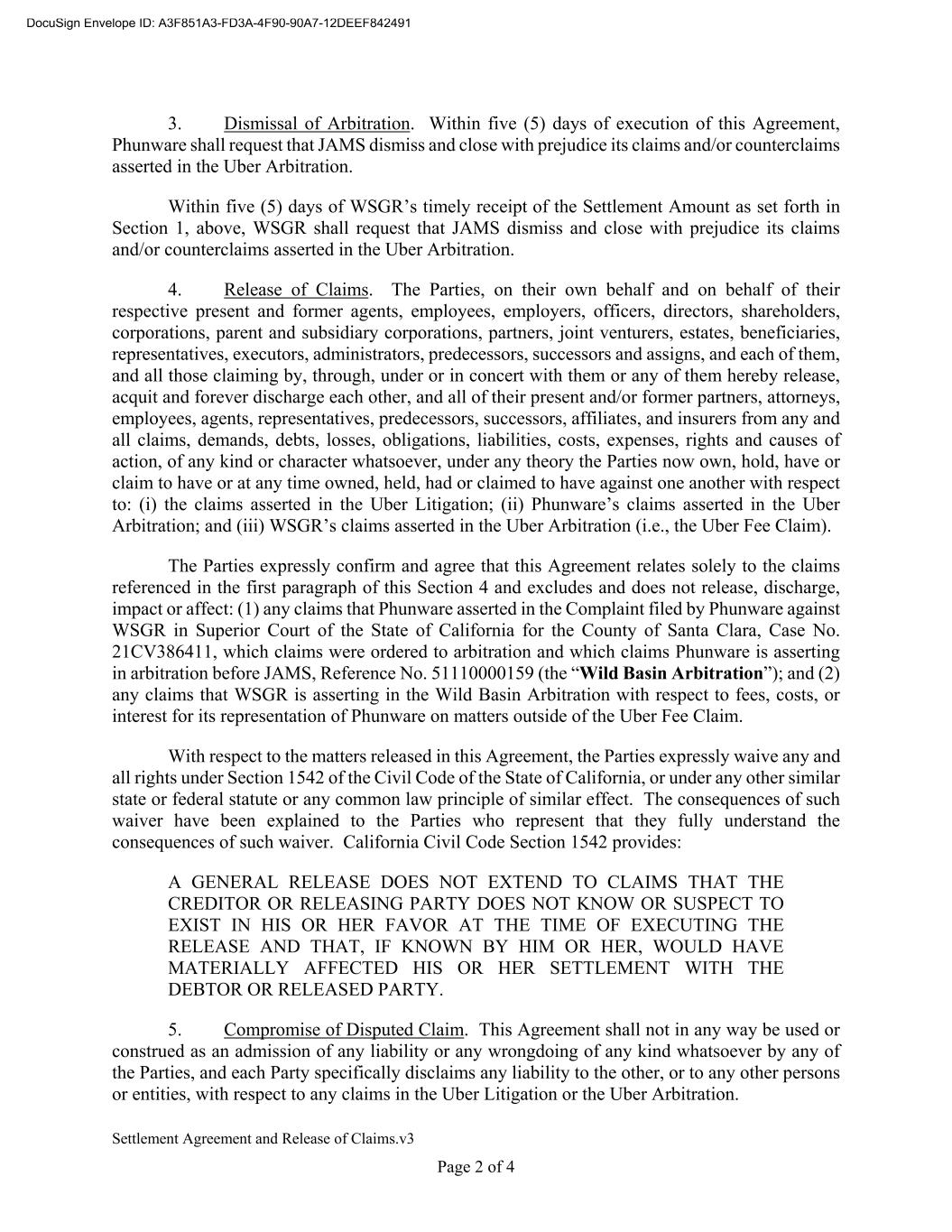 Settlement Agreement and Release of Claims.v3 Page 2 of 4 3. Dismissal of Arbitration. Within five (5) days of execution of this Agreement, Phunware shall request that JAMS dismiss and close with prejudice its claims and/or counterclaims asserted in the Uber Arbitration. Within five (5) days of WSGR’s timely receipt of the Settlement Amount as set forth in Section 1, above, WSGR shall request that JAMS dismiss and close with prejudice its claims and/or counterclaims asserted in the Uber Arbitration. 4. Release of Claims. The Parties, on their own behalf and on behalf of their respective present and former agents, employees, employers, officers, directors, shareholders, corporations, parent and subsidiary corporations, partners, joint venturers, estates, beneficiaries, representatives, executors, administrators, predecessors, successors and assigns, and each of them, and all those claiming by, through, under or in concert with them or any of them hereby release, acquit and forever discharge each other, and all of their present and/or former partners, attorneys, employees, agents, representatives, predecessors, successors, affiliates, and insurers from any and all claims, demands, debts, losses, obligations, liabilities, costs, expenses, rights and causes of action, of any kind or character whatsoever, under any theory the Parties now own, hold, have or claim to have or at any time owned, held, had or claimed to have against one another with respect to: (i) the claims asserted in the Uber Litigation; (ii) Phunware’s claims asserted in the Uber Arbitration; and (iii) WSGR’s claims asserted in the Uber Arbitration (i.e., the Uber Fee Claim). The Parties expressly confirm and agree that this Agreement relates solely to the claims referenced in the first paragraph of this Section 4 and excludes and does not release, discharge, impact or affect: (1) any claims that Phunware asserted in the Complaint filed by Phunware against WSGR in Superior Court of the State of California for the County of Santa Clara, Case No. 21CV386411, which claims were ordered to arbitration and which claims Phunware is asserting in arbitration before JAMS, Reference No. 51110000159 (the “Wild Basin Arbitration”); and (2) any claims that WSGR is asserting in the Wild Basin Arbitration with respect to fees, costs, or interest for its representation of Phunware on matters outside of the Uber Fee Claim. With respect to the matters released in this Agreement, the Parties expressly waive any and all rights under Section 1542 of the Civil Code of the State of California, or under any other similar state or federal statute or any common law principle of similar effect. The consequences of such waiver have been explained to the Parties who represent that they fully understand the consequences of such waiver. California Civil Code Section 1542 provides: A GENERAL RELEASE DOES NOT EXTEND TO CLAIMS THAT THE CREDITOR OR RELEASING PARTY DOES NOT KNOW OR SUSPECT TO EXIST IN HIS OR HER FAVOR AT THE TIME OF EXECUTING THE RELEASE AND THAT, IF KNOWN BY HIM OR HER, WOULD HAVE MATERIALLY AFFECTED HIS OR HER SETTLEMENT WITH THE DEBTOR OR RELEASED PARTY. 5. Compromise of Disputed Claim. This Agreement shall not in any way be used or construed as an admission of any liability or any wrongdoing of any kind whatsoever by any of the Parties, and each Party specifically disclaims any liability to the other, or to any other persons or entities, with respect to any claims in the Uber Litigation or the Uber Arbitration.