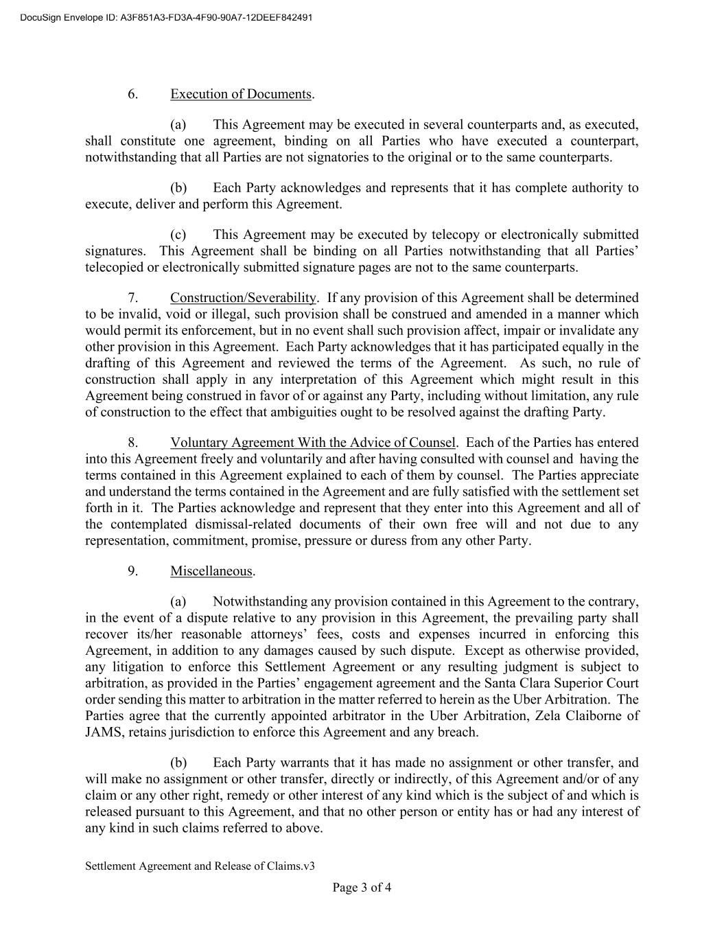 Settlement Agreement and Release of Claims.v3 Page 3 of 4 6. Execution of Documents. (a) This Agreement may be executed in several counterparts and, as executed, shall constitute one agreement, binding on all Parties who have executed a counterpart, notwithstanding that all Parties are not signatories to the original or to the same counterparts. (b) Each Party acknowledges and represents that it has complete authority to execute, deliver and perform this Agreement. (c) This Agreement may be executed by telecopy or electronically submitted signatures. This Agreement shall be binding on all Parties notwithstanding that all Parties’ telecopied or electronically submitted signature pages are not to the same counterparts. 7. Construction/Severability. If any provision of this Agreement shall be determined to be invalid, void or illegal, such provision shall be construed and amended in a manner which would permit its enforcement, but in no event shall such provision affect, impair or invalidate any other provision in this Agreement. Each Party acknowledges that it has participated equally in the drafting of this Agreement and reviewed the terms of the Agreement. As such, no rule of construction shall apply in any interpretation of this Agreement which might result in this Agreement being construed in favor of or against any Party, including without limitation, any rule of construction to the effect that ambiguities ought to be resolved against the drafting Party. 8. Voluntary Agreement With the Advice of Counsel. Each of the Parties has entered into this Agreement freely and voluntarily and after having consulted with counsel and having the terms contained in this Agreement explained to each of them by counsel. The Parties appreciate and understand the terms contained in the Agreement and are fully satisfied with the settlement set forth in it. The Parties acknowledge and represent that they enter into this Agreement and all of the contemplated dismissal-related documents of their own free will and not due to any representation, commitment, promise, pressure or duress from any other Party. 9. Miscellaneous. (a) Notwithstanding any provision contained in this Agreement to the contrary, in the event of a dispute relative to any provision in this Agreement, the prevailing party shall recover its/her reasonable attorneys’ fees, costs and expenses incurred in enforcing this Agreement, in addition to any damages caused by such dispute. Except as otherwise provided, any litigation to enforce this Settlement Agreement or any resulting judgment is subject to arbitration, as provided in the Parties’ engagement agreement and the Santa Clara Superior Court order sending this matter to arbitration in the matter referred to herein as the Uber Arbitration. The Parties agree that the currently appointed arbitrator in the Uber Arbitration, Zela Claiborne of JAMS, retains jurisdiction to enforce this Agreement and any breach. (b) Each Party warrants that it has made no assignment or other transfer, and will make no assignment or other transfer, directly or indirectly, of this Agreement and/or of any claim or any other right, remedy or other interest of any kind which is the subject of and which is released pursuant to this Agreement, and that no other person or entity has or had any interest of any kind in such claims referred to above.
