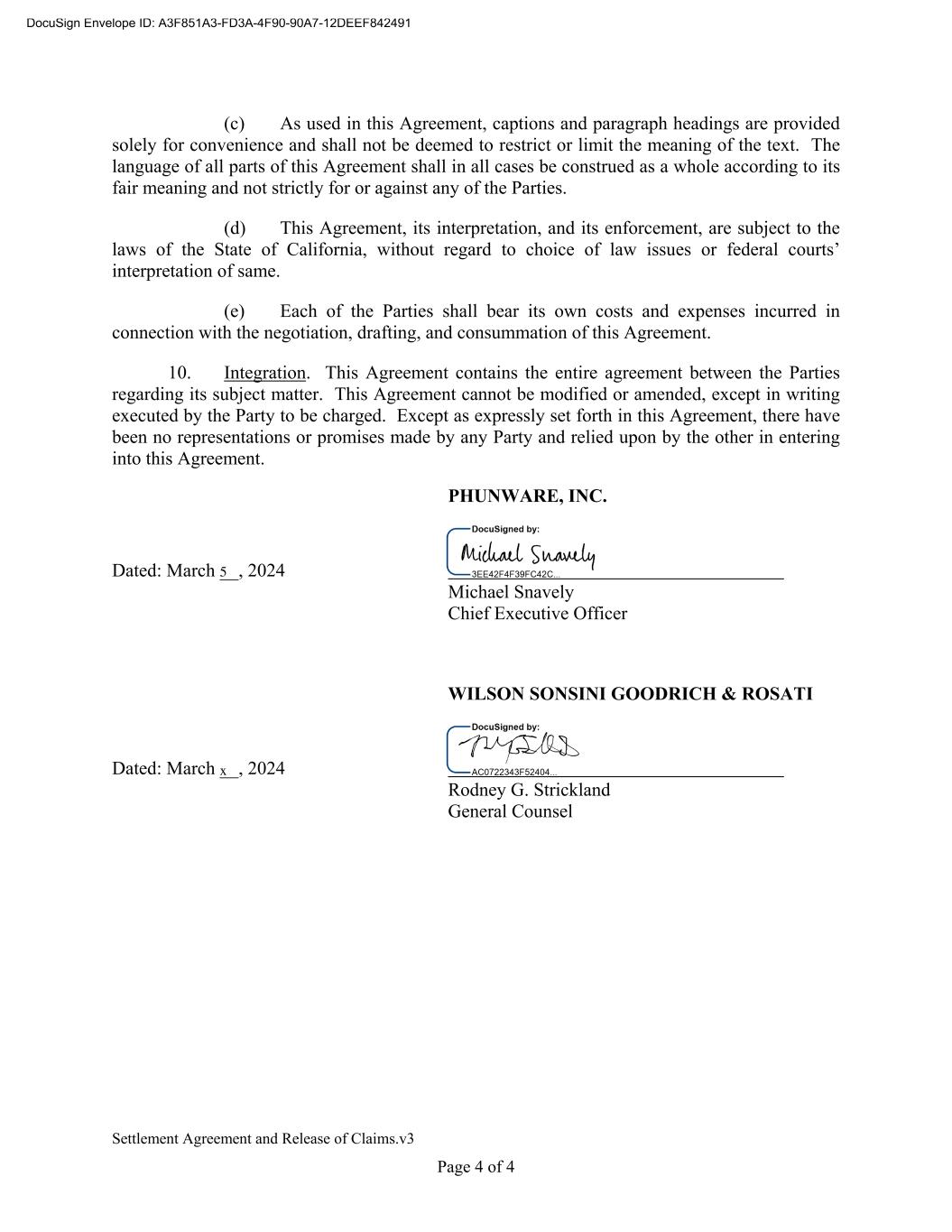Settlement Agreement and Release of Claims.v3 Page 4 of 4 (c) As used in this Agreement, captions and paragraph headings are provided solely for convenience and shall not be deemed to restrict or limit the meaning of the text. The language of all parts of this Agreement shall in all cases be construed as a whole according to its fair meaning and not strictly for or against any of the Parties. (d) This Agreement, its interpretation, and its enforcement, are subject to the laws of the State of California, without regard to choice of law issues or federal courts’ interpretation of same. (e) Each of the Parties shall bear its own costs and expenses incurred in connection with the negotiation, drafting, and consummation of this Agreement. 10. Integration. This Agreement contains the entire agreement between the Parties regarding its subject matter. This Agreement cannot be modified or amended, except in writing executed by the Party to be charged. Except as expressly set forth in this Agreement, there have been no representations or promises made by any Party and relied upon by the other in entering into this Agreement. PHUNWARE, INC. Dated: March __, 2024 Michael Snavely Chief Executive Officer WILSON SONSINI GOODRICH & ROSATI Dated: March __, 2024 Rodney G. Strickland General Counsel 5 x