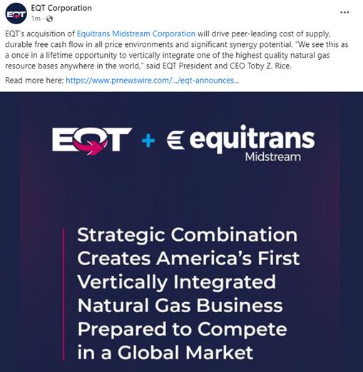 The following were posted by EQT Corporation (“EQT” or “Parent”) on its social media accounts on March 14, 2024, regarding its proposed acquisition (the “transaction”) of Equitrans Midstream Corporation (“Equitrans” or the “Company”):